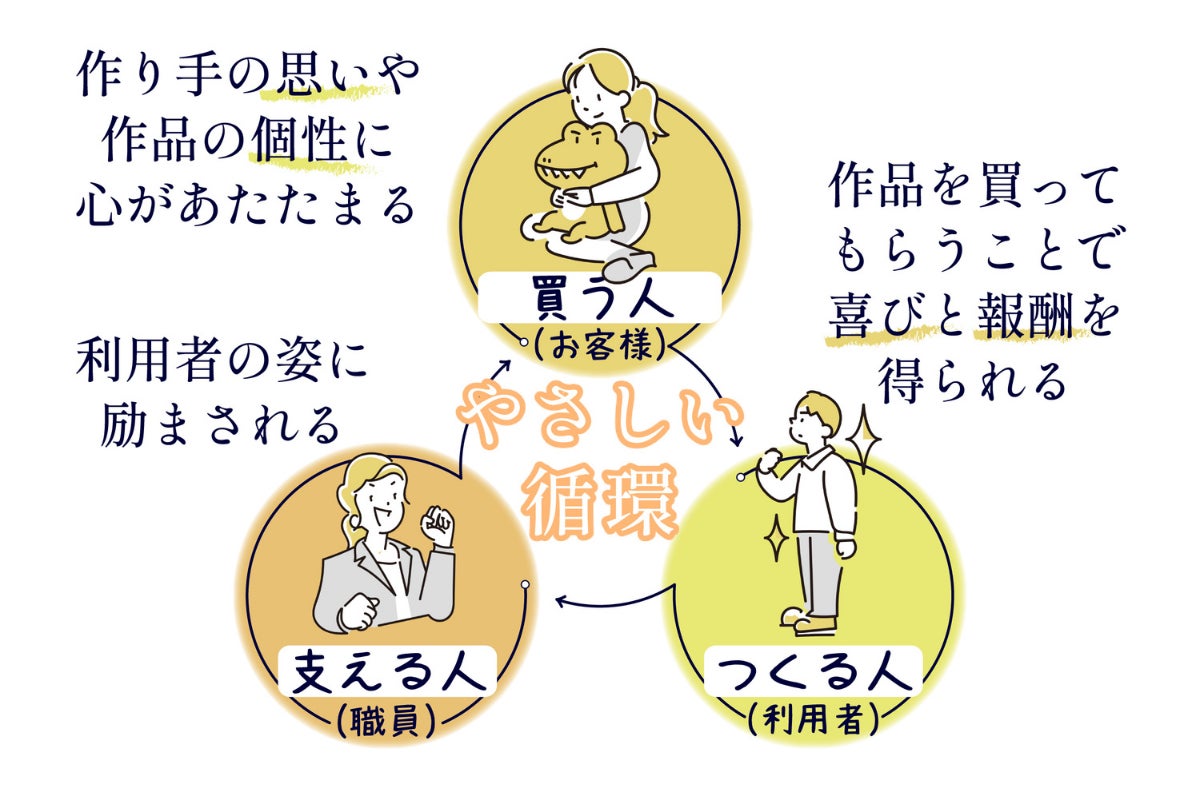 誰かの想いや心がこもった“モノ”を手にした人が、日々の暮らしの中でぬくもりを感じる。作り手にとっては、それが何よりの励ましになる。そして、障害を抱えるメンバーと一緒に働く職員も、彼らのまっすぐな姿勢や集中力に日々励まされる。