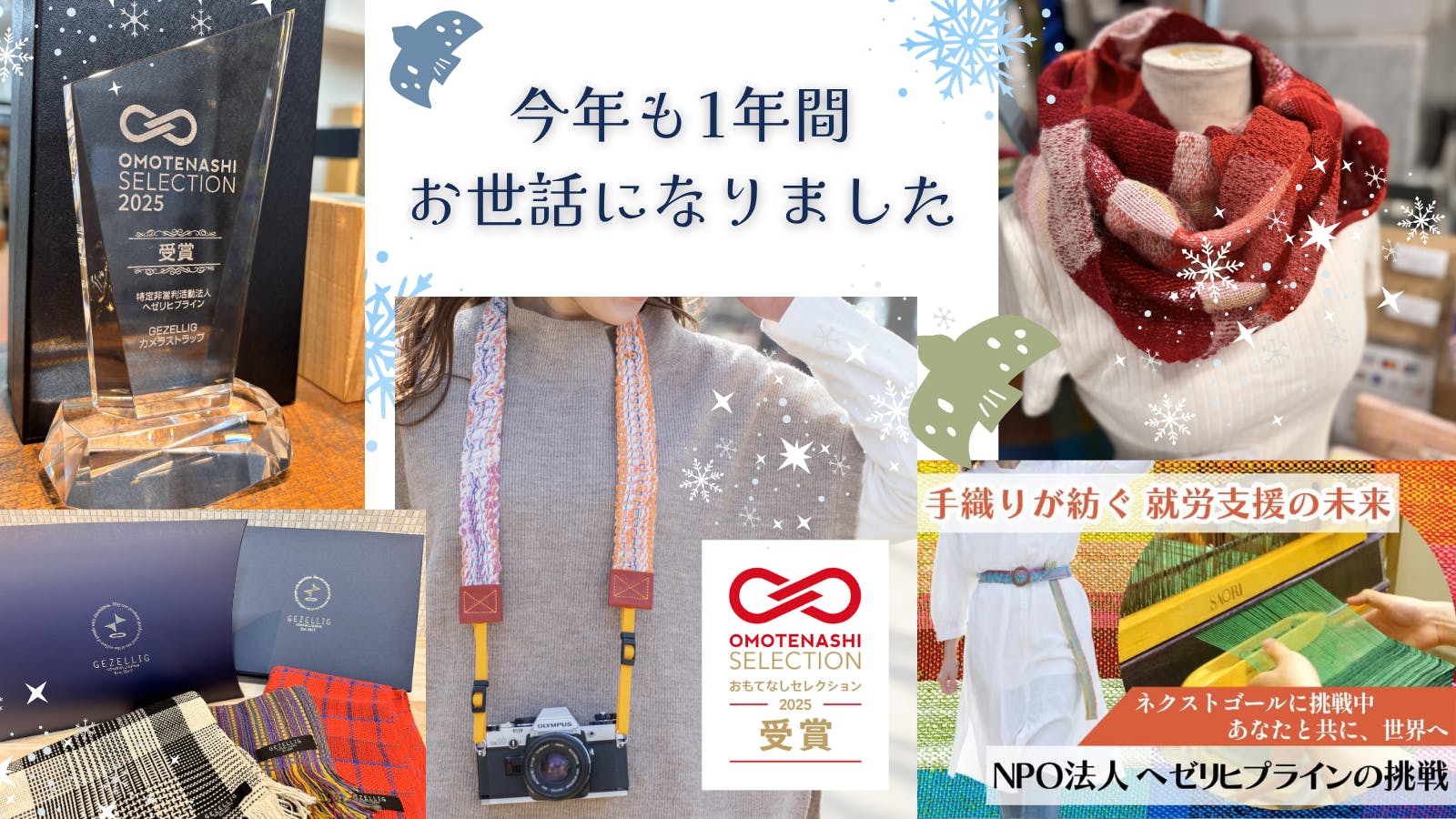 皆さま、こんにちは。NPO法人ヘゼリヒプライン 代表の竹樋(たけひ)です。2025年も残すところあと僅かとなりました。今年は、オンラインショップの全面リニューアルや「GEZELLIG」のブランド名を冠したマフラー・ストールの販売開始など、飛躍へと大きく歩み出した一年でした。特に12月には、クラウドファンディングという挑戦もスタート!皆さまが温かく呼応してくださったおかげで、当初目標としていた20万円をわずか3日で達成することができました。温かいご支援とメッセージに、心より感謝申し上げます。こうした取り組みを通じて、オンラインショップでたくさんのご注文をいただいたり、新聞やネットニュースで取り上げていただいたりと、嬉しい出来事もたくさん起こりました。草の根のように、地道に、丁寧に続けてきた活動が注目された実感があり、事業所にはこれまでにない良い緊張感と活気が漂っています。利用者・スタッフともに、精一杯頑張ったと思える年末になりました。それも、皆さまが私たちを支えてくださったおかげです。来年は、未だヘゼリヒプラインを知らないたくさんの方々と出会い、繋がれるよう、活動をさらに加速させてまいります。 引き続き、私たちを応援し、見守っていただけますと幸いです。なお、年末年始は、12月27日(土)〜1月4日(日)までお休みをいただいております。この期間にいただいたご連絡には、年明け1月5日から順次お返事させていただきますのでお待ちください。それでは皆さま、どうぞ良いお年をお迎えください。