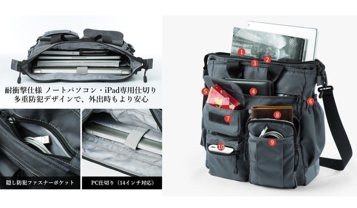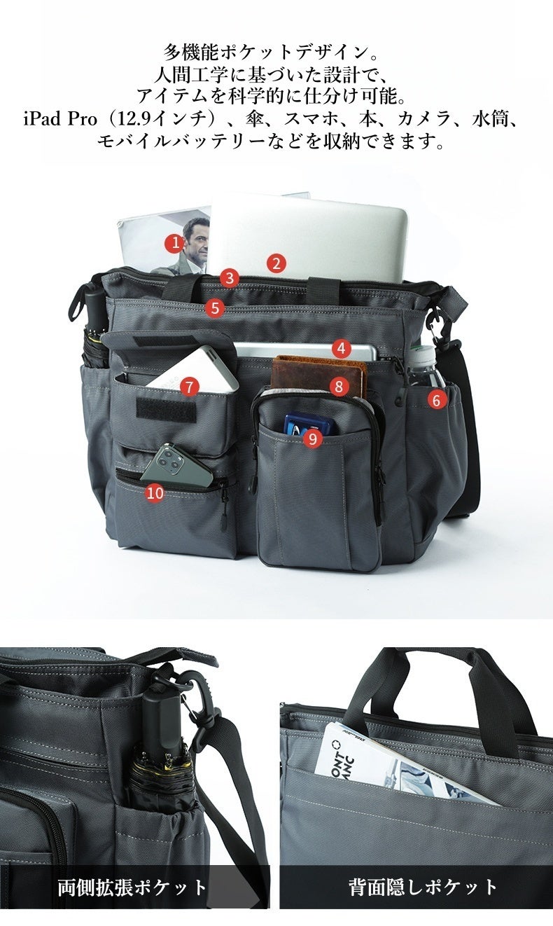 前面+側面+背面+内部まで、計10ポケット構造で小物の整理が圧倒的にラク。