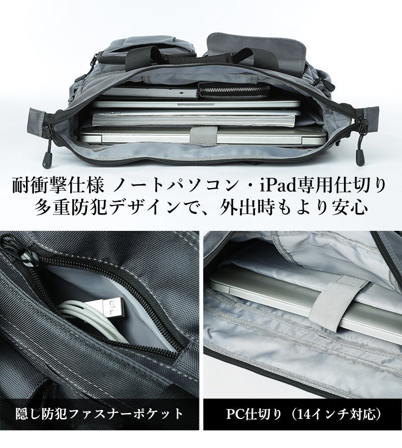 14インチノートPC、iPad Pro12.9まで収納可能。