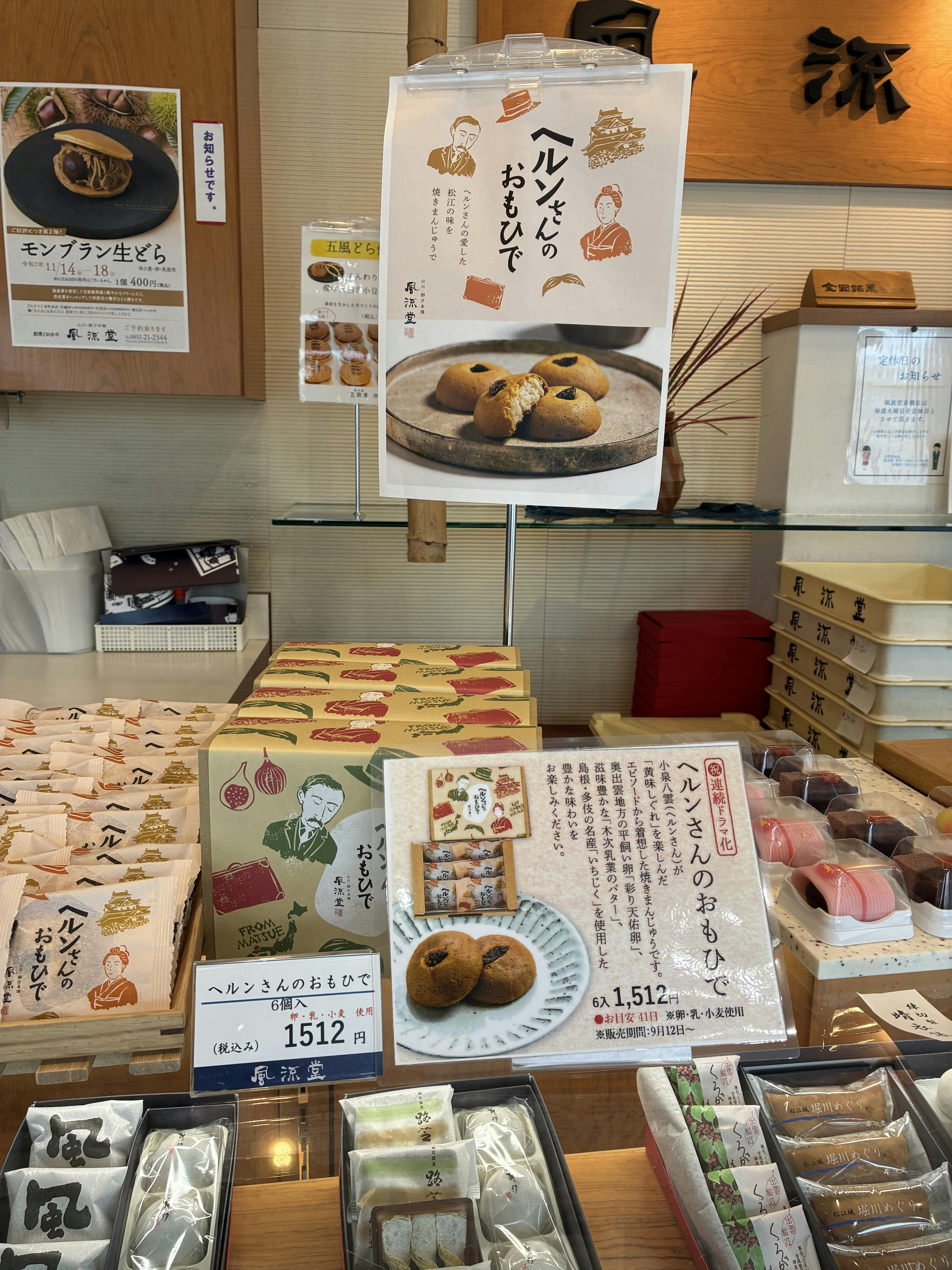 そしてそして今一番熱い話題といえば、NHK連続テレビ小説「ばけばけ」の舞台となっているのがここ松江市なのです。市内ではばけばけにちなんだお菓子が作られたり、のぼりやポスターが街の至る所に掲示されるなど、ばけばけブームで盛り上げっています。