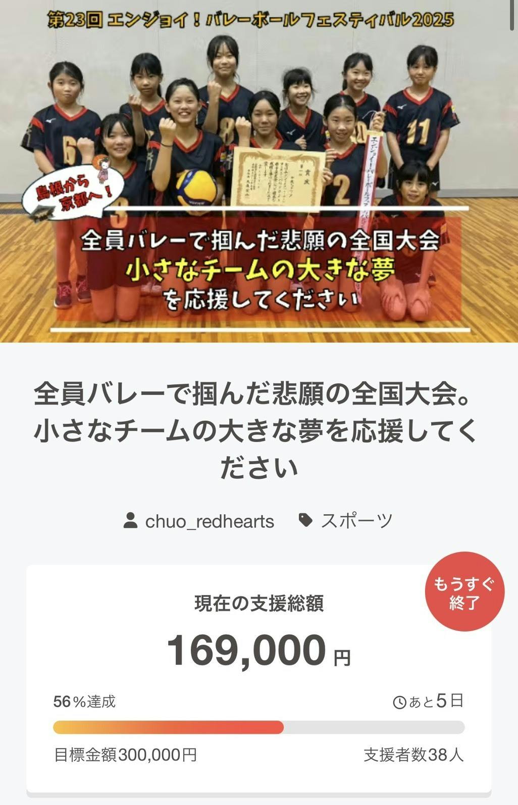 総額:169,000円(目標の56%)・支援者数:38人となりました!