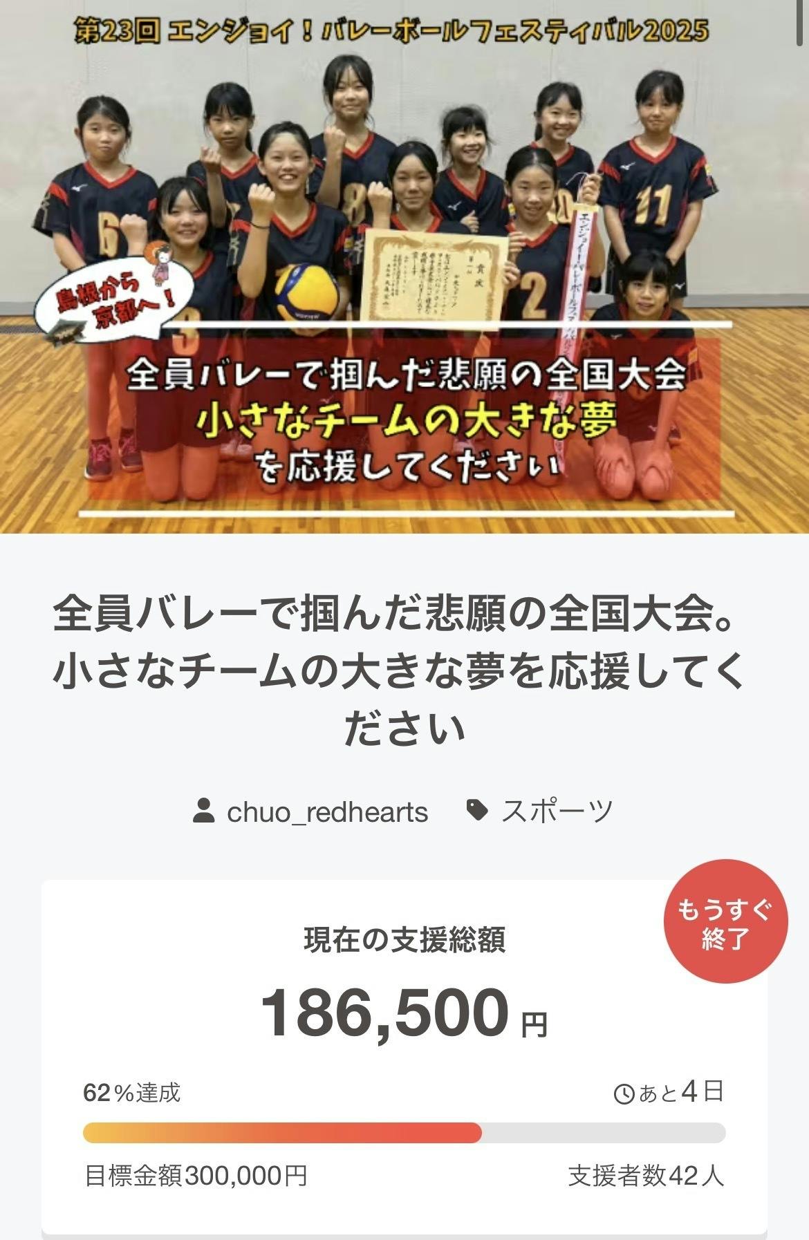 総額:186,500円(目標の62%)・支援者数:42人となりました!