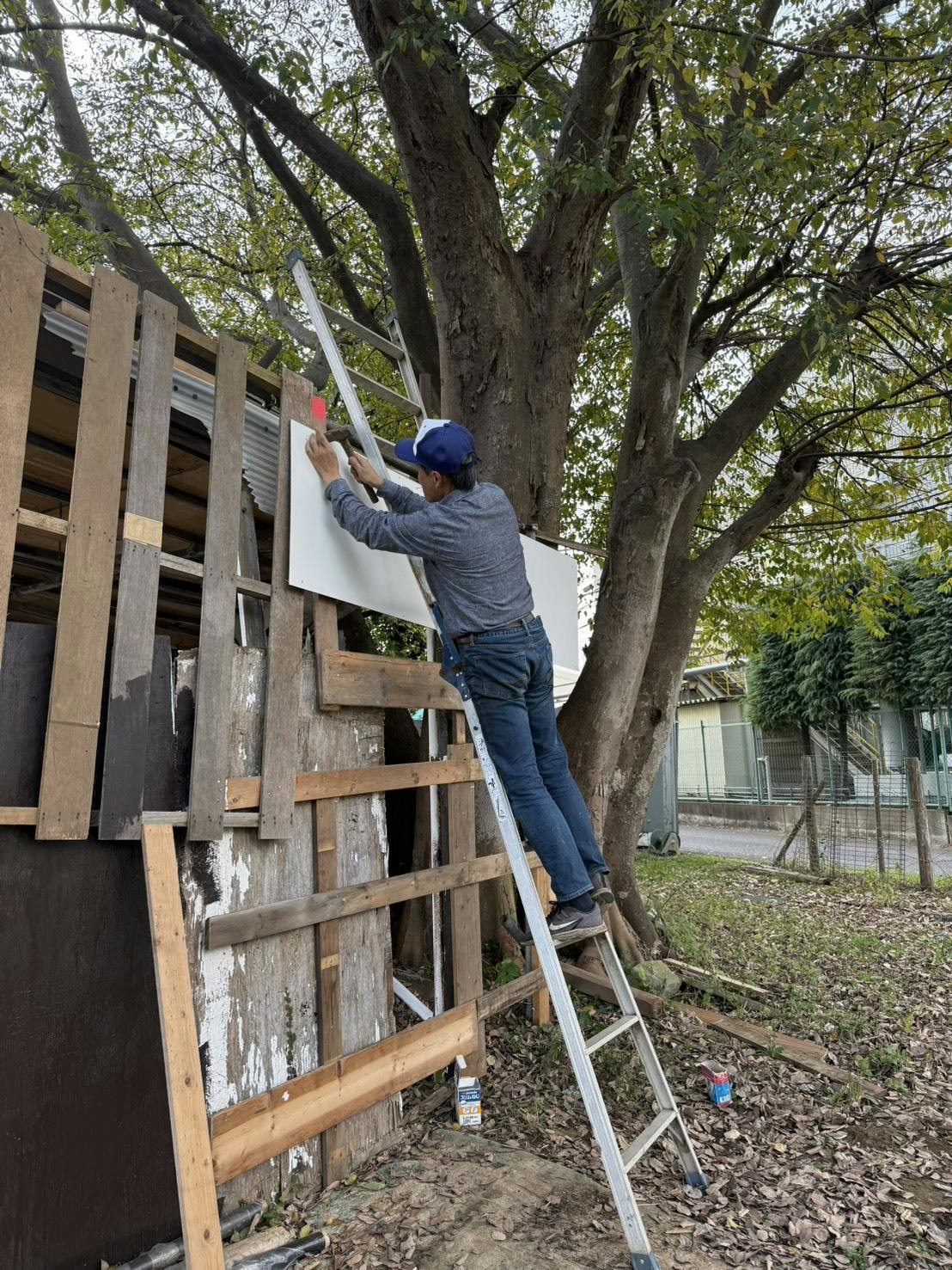 どうにかここまでかき集めた板と木材で少しづつ・・・
