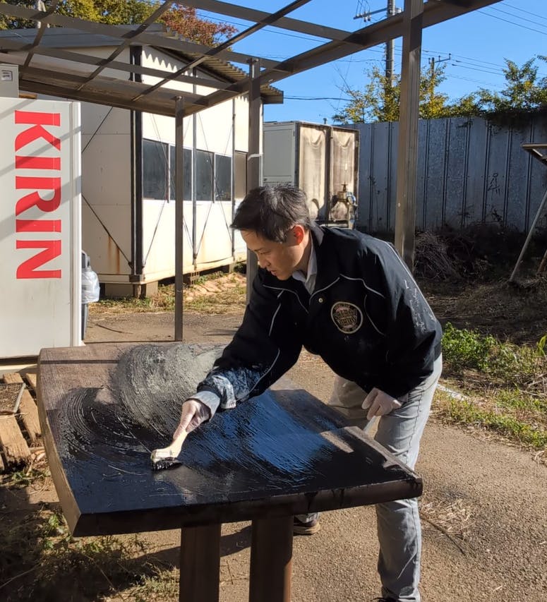 11月12日水曜日はペンキ作業です 2025/11/12 11:41 良い天気なので本日はペンキ作業にグラウンドに来ました。椅子も木製なので雨や紫外線で傷んできているのでペンキで保護します。黒く塗っていい感じになりました!