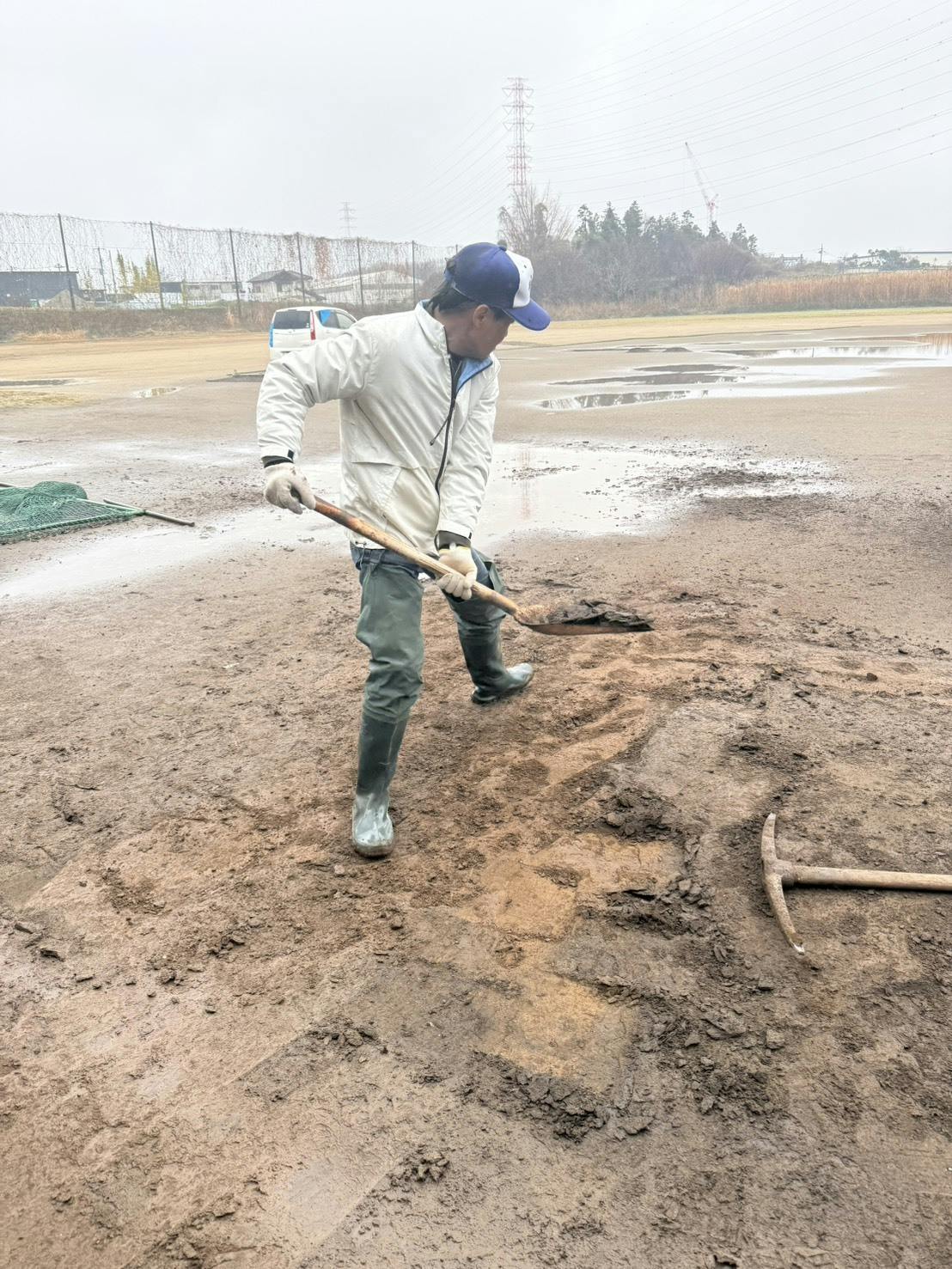 午前中は雨でしたがグラウンドに来てひとまず休憩。すでに一試合終えて選手たちは片づけ。午後からは雨も上がるので整地作業をしました。かなりきつい作業でしたが水はけを良くするためには重要です!