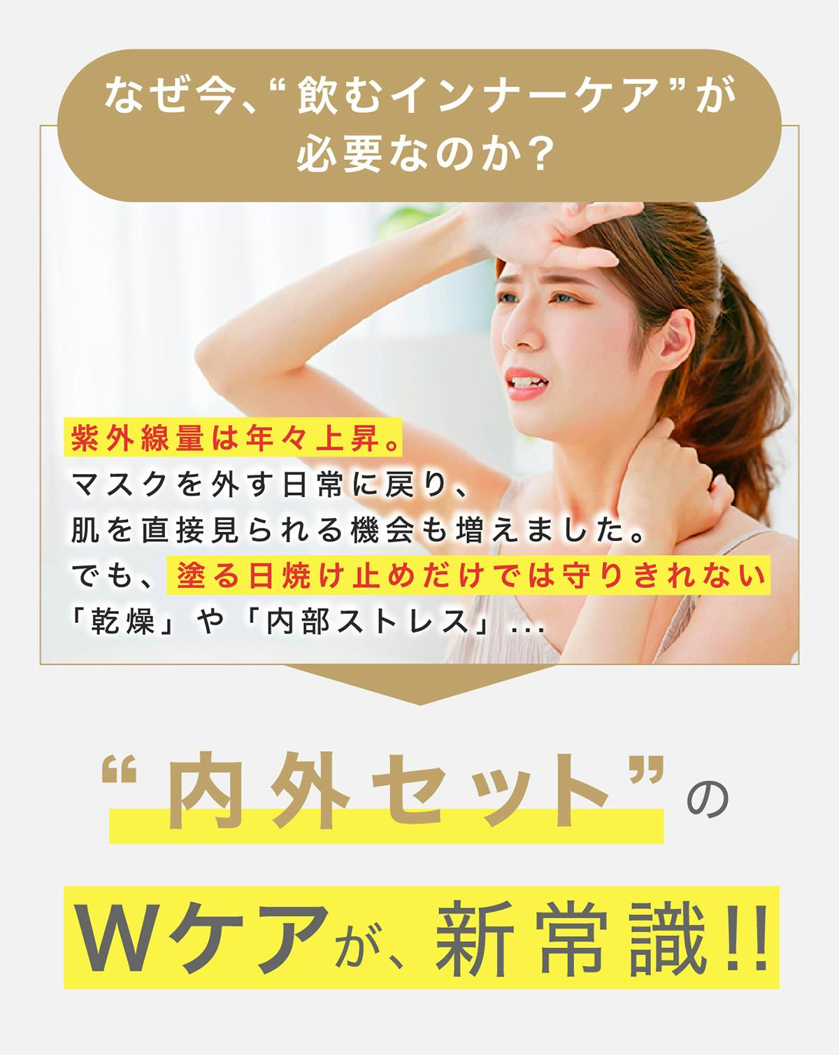 日焼け止めクリームで外側をケア。飲む白玉美容点滴で内側をケアのWケアが新常識です!