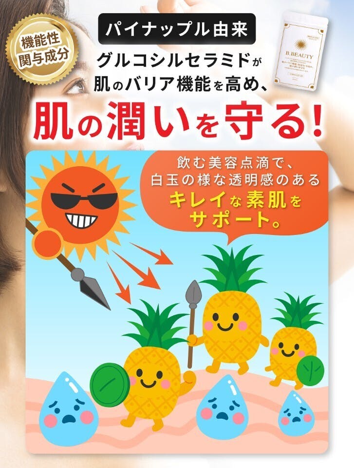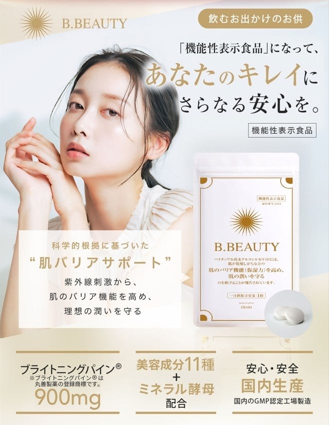 日焼け対策、乾燥肌対策、シミしわ対策に適した最新の機能性表示食品「B.Beauty」です。