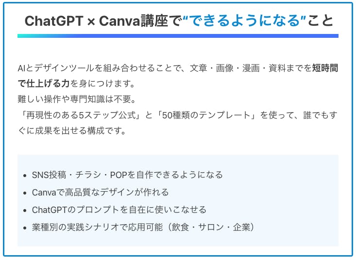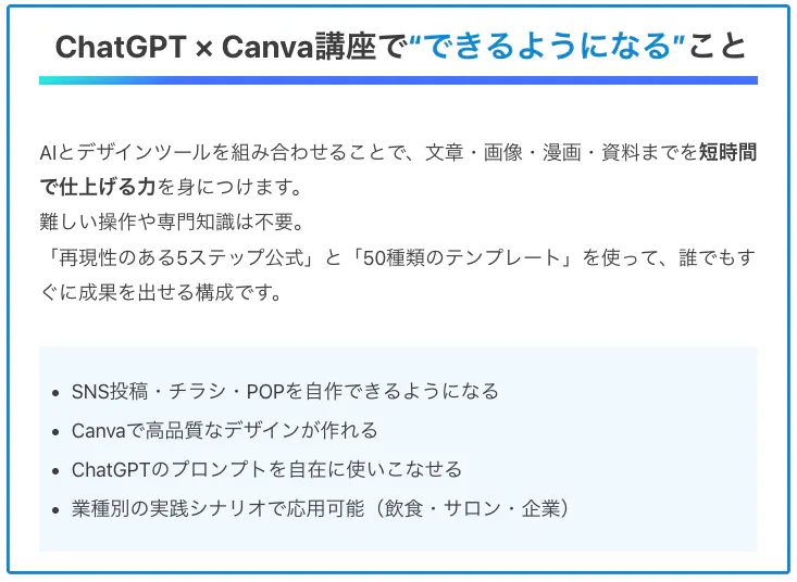 この学習サイトでは、ChatGPTでの文章設計からCanvaによるデザインまで、「考える」「作る」「伝える」を一気通貫で学べます。
