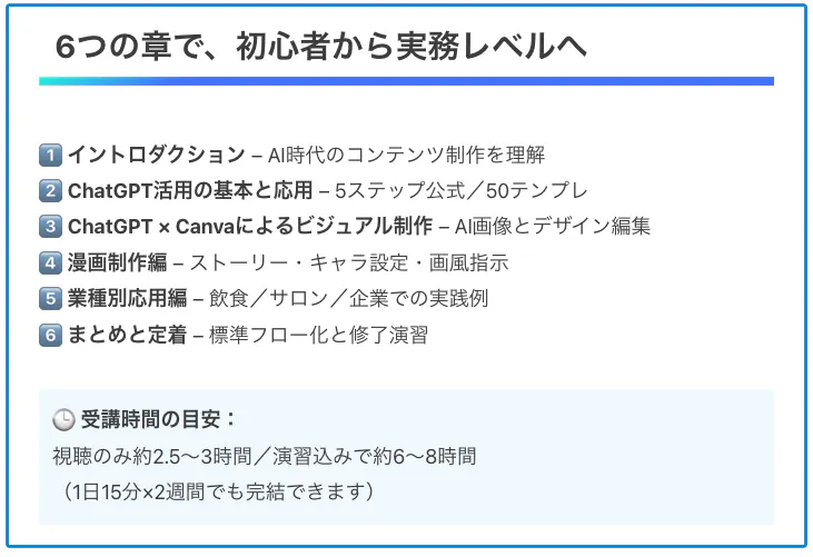 ・全6章の視聴が可能(基礎〜業種別応用〜まとめまで)