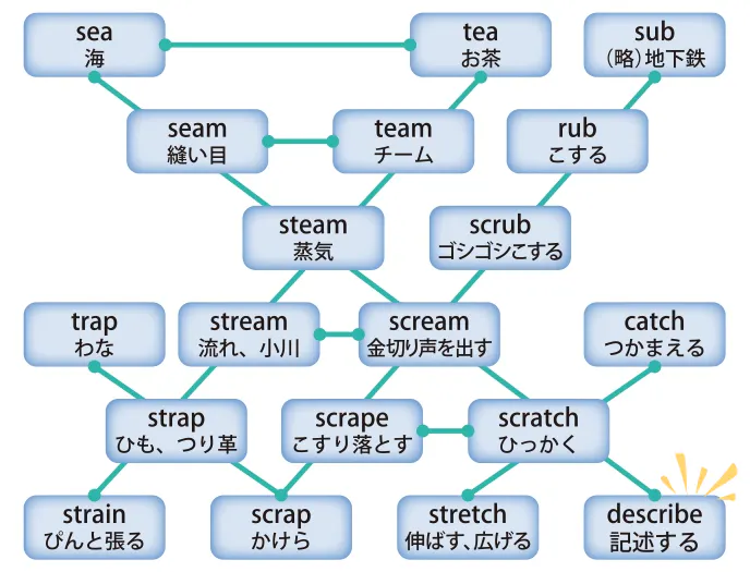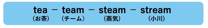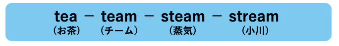 これらの語も、ほとんどが暮らしの中で見たり聞いたりしたことがある単語ではないでしょうか? steam は s+team、そこに r を加えれば stream だと気づけば、何度もノートに書いて練習する必要はなくなります。