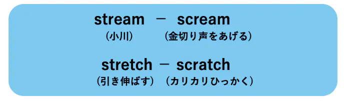 さらに stream の t を c にすれば scream ですが、これも「スクラッチカード」などでおなじみの scratch にむすびつければ、効率的に記憶できます。