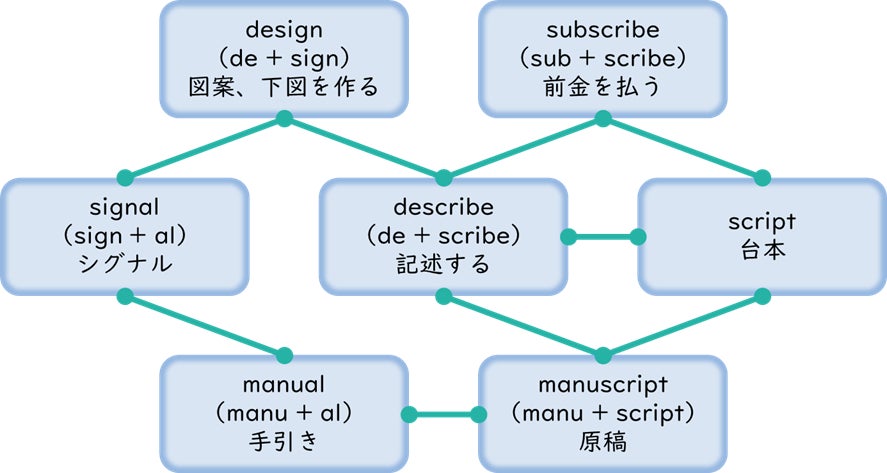 さらに「楽習アプリ:英単語ナビ」では、同じ語源から生まれた語をむすびつけるなどして学びを効率化します! 例えば describe(= de + scribe)は scratch の他に「サブスク」でおなじみの subscribe(= sub + scribe)などと結びつければ、記憶にも残りやすくなるばかりでなく、さらに多くの語を習得できます。
