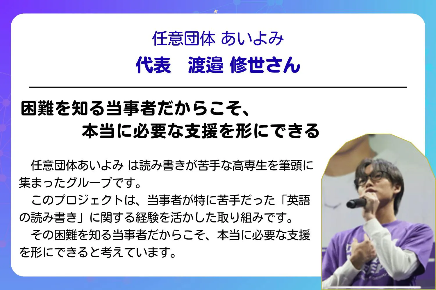 新しい社会との橋渡しを形にすることを目指した学生団体です。2024年からアプリ開発、ハードの研究、当事者との情報交換などを主に取り組んでいます。ディスレクシア当事者が考える、「日頃の学習負担を減らし、学習意欲を損なわない環境を作る」ことを目的としています