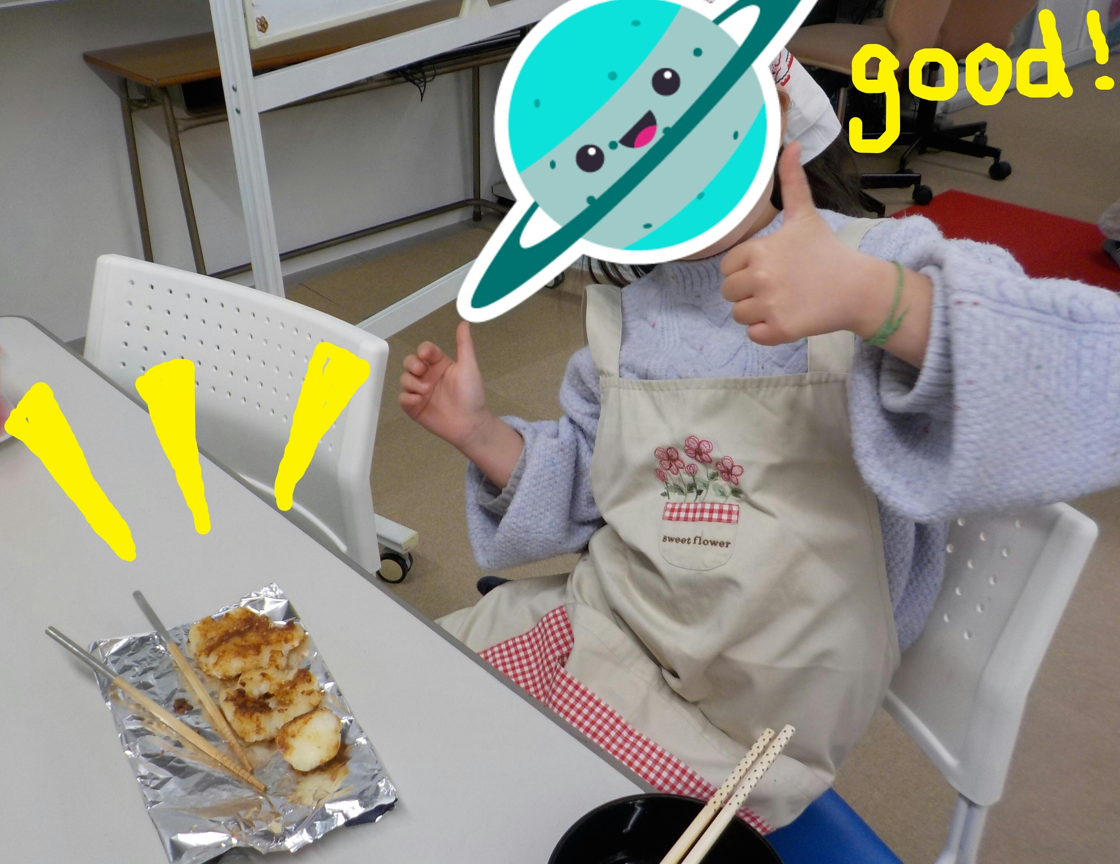 焼きあがったお煎餅を頬張り、「めちゃ美味しい!」と満面の笑みを浮かべる子どもたち。