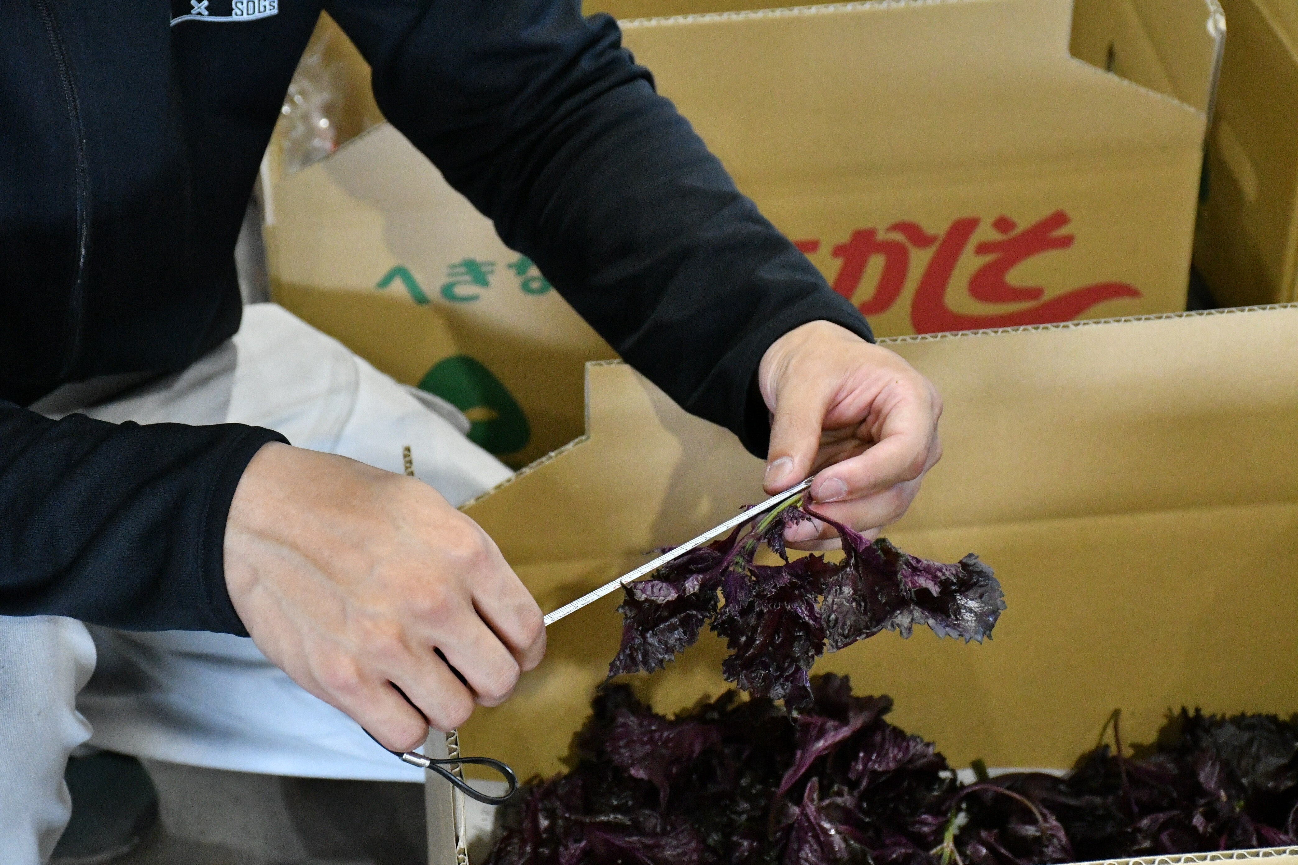 品質基準の項目は色や見た目だけでなく、出荷形態、特に葉に付いている茎の長さなど、赤しそを実際に使う消費者のために考えられた内容も含まれています。