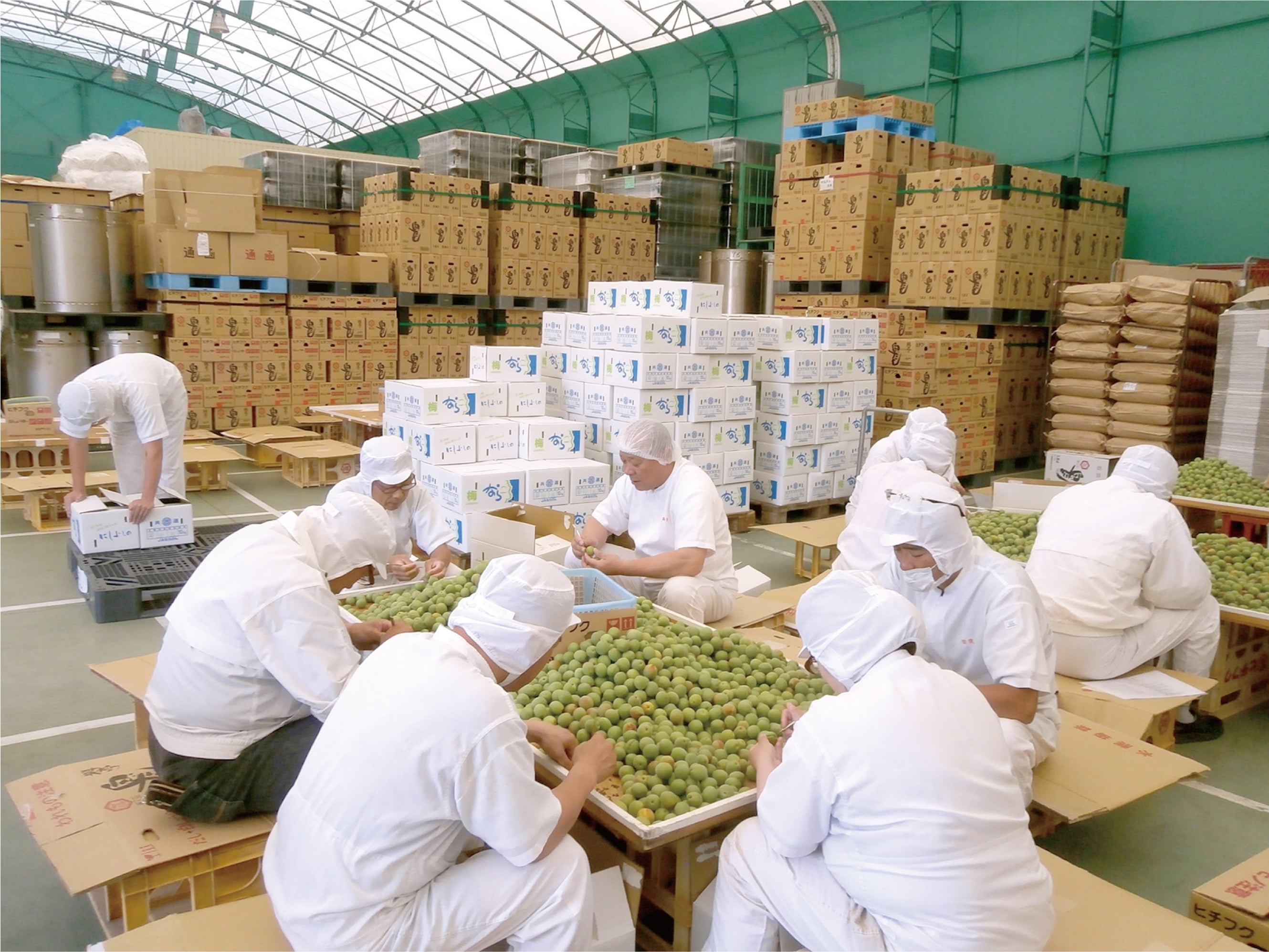 (社員の手で行う梅のヘタ取り)