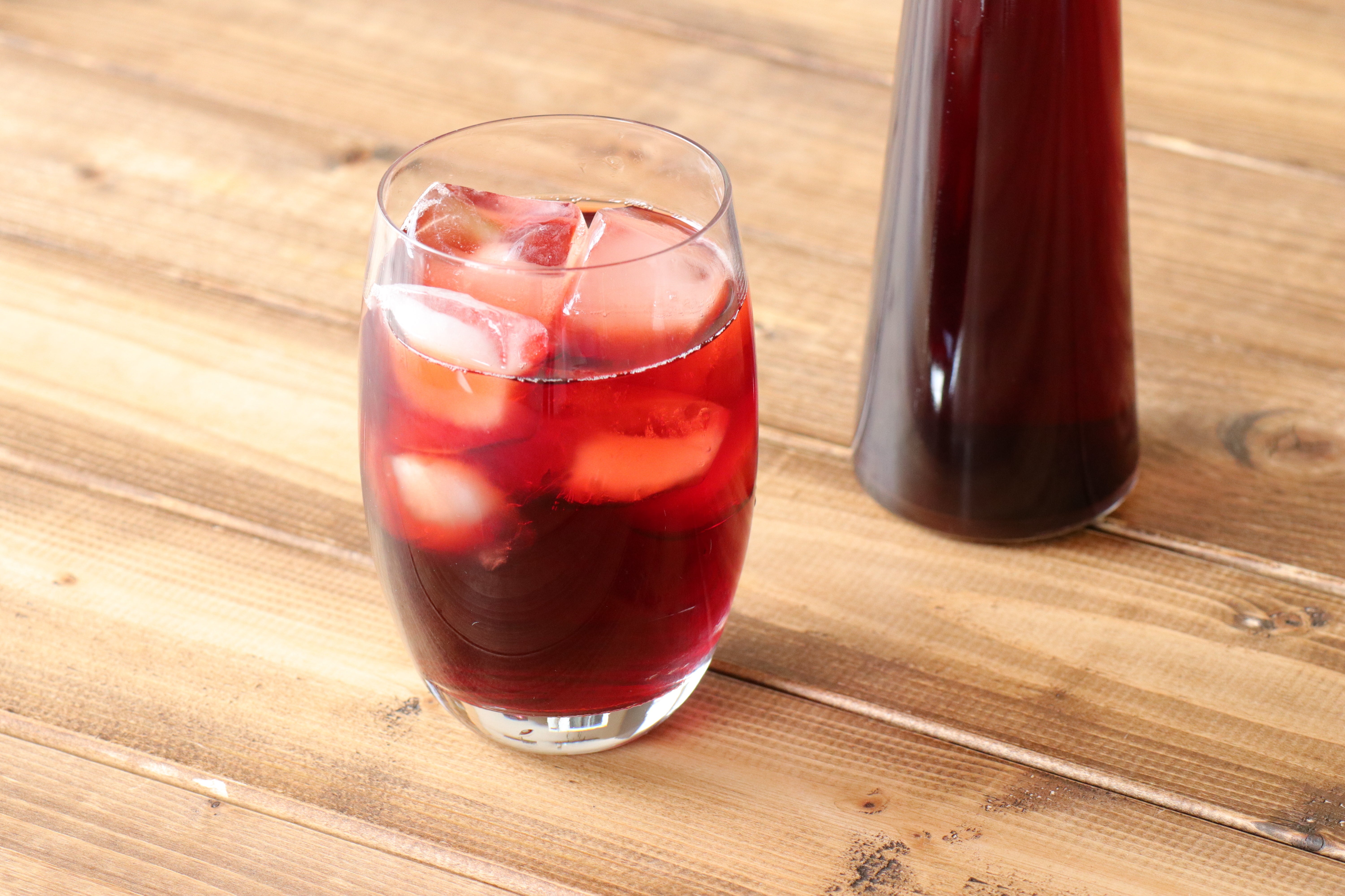 「赤しそドリンク」はお好みの濃さで水や炭酸水で割って飲んでもらえますが、赤しそドリンクの味そのままを楽しんでいただける氷を入れたロックがおすすめです。