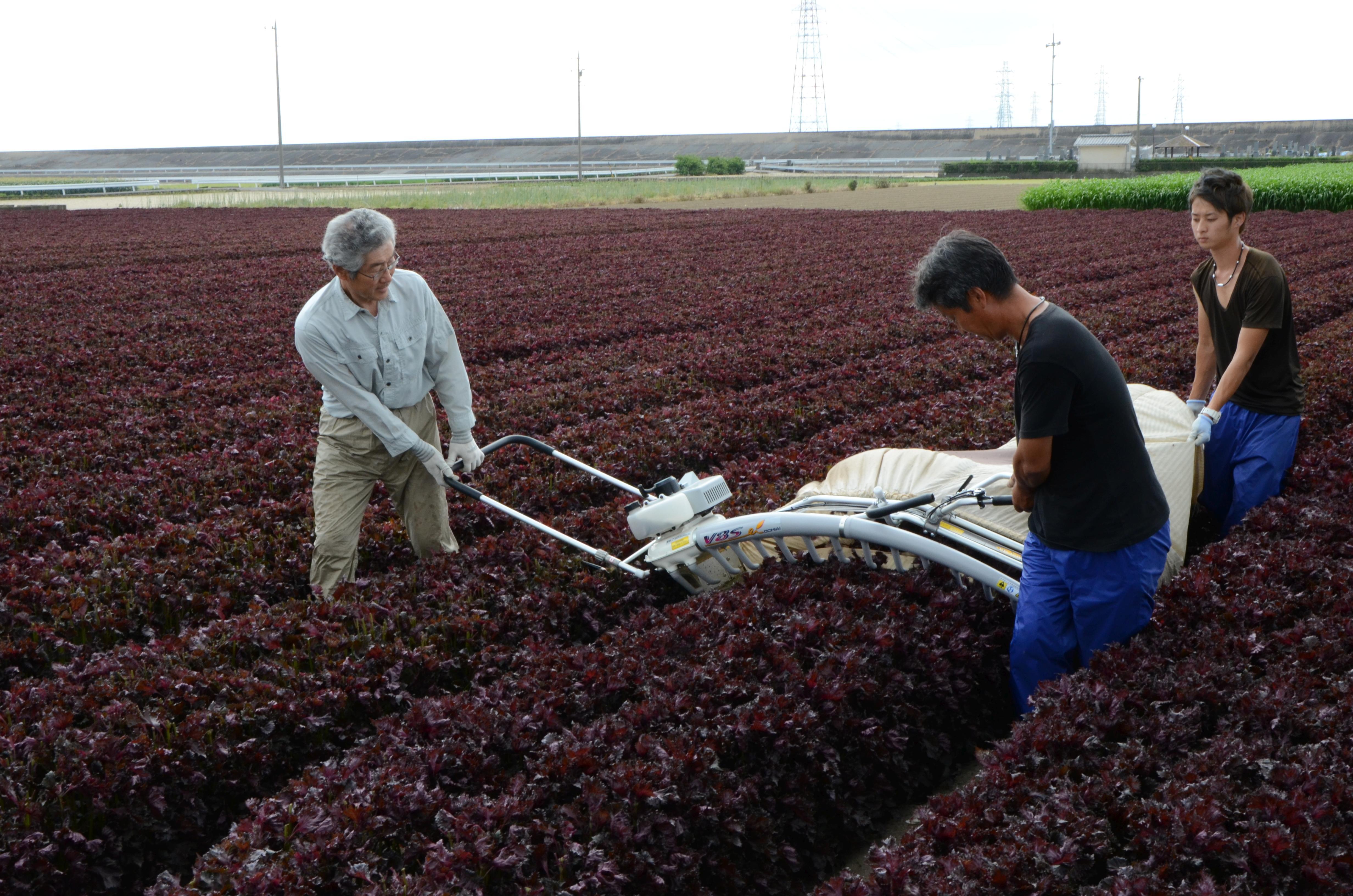 (茶刈機による赤しそ収穫風景)