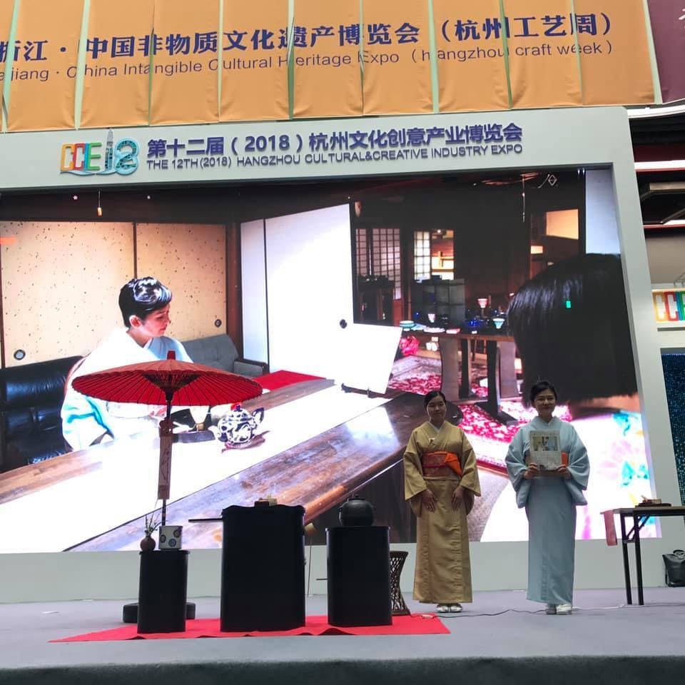 やっと情報解禁になりましたので遅くなりましたがご報告いたします。中国で毎日テレビ放映され沢山の方にご興味を持って頂き茶道裏千家 坐忘斎考案和親棚とテーブル茶道 [盆利点前]の点前を披露してまいりました。NHKの「半分、青い」の番組の中で鈴愛さんが飲まれた茶碗はじめ数々の貴重な茶道具でおもてなししました。素晴らしい機会を与えて頂きお世話になりました関係者の方々ありがとうございました。車いすおもてなし隊の事もご紹介頂きましたので新聞を持ってステージに立っています。