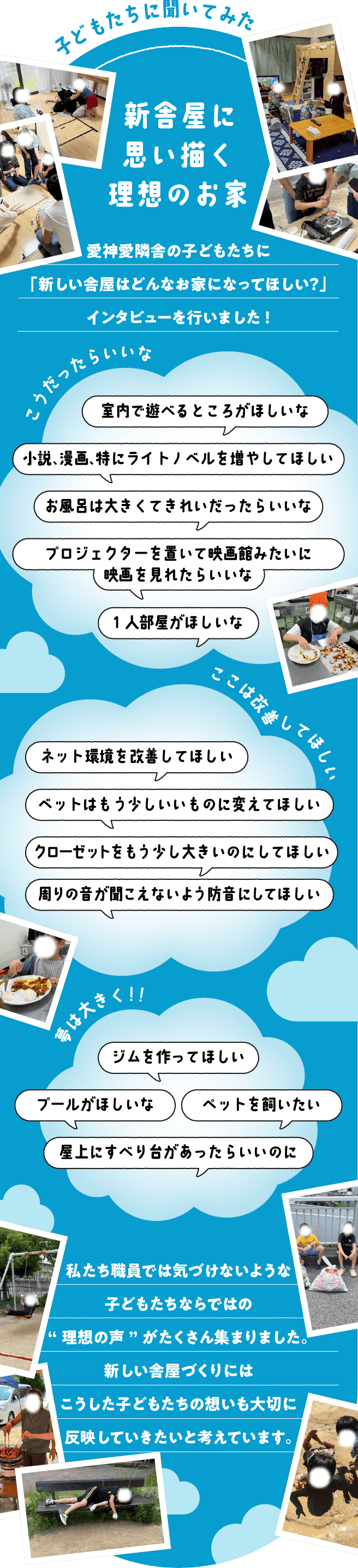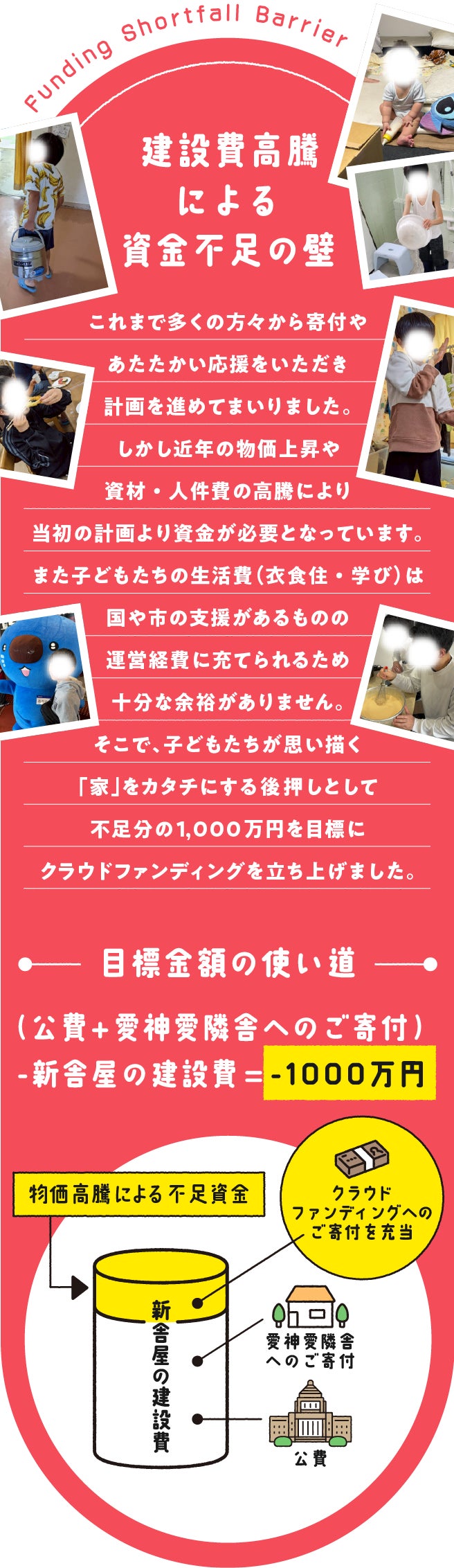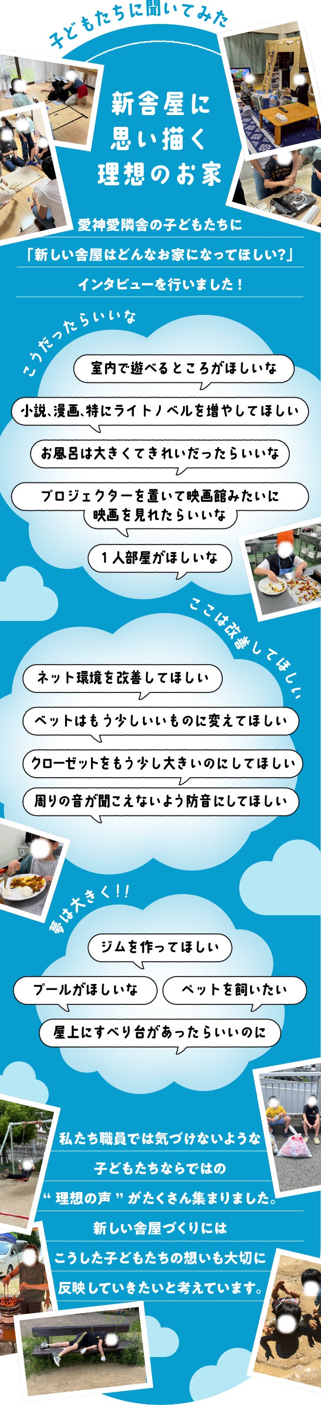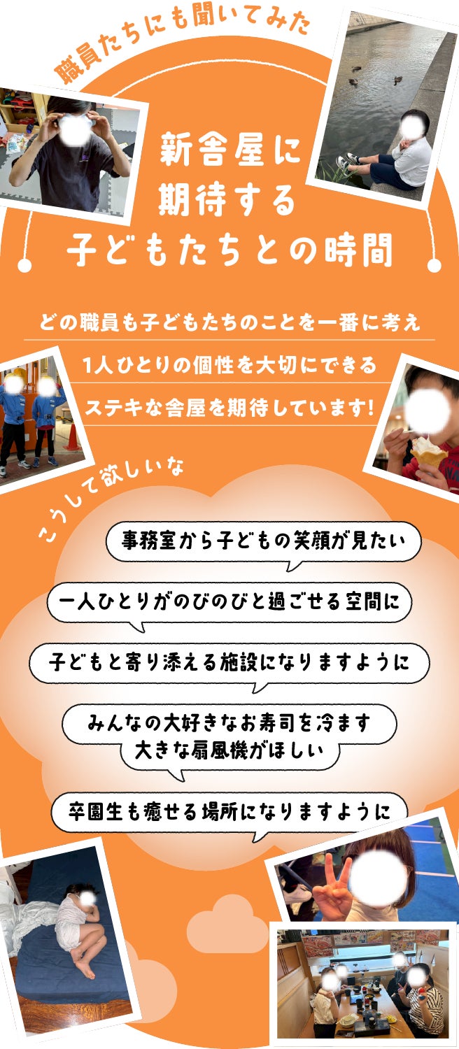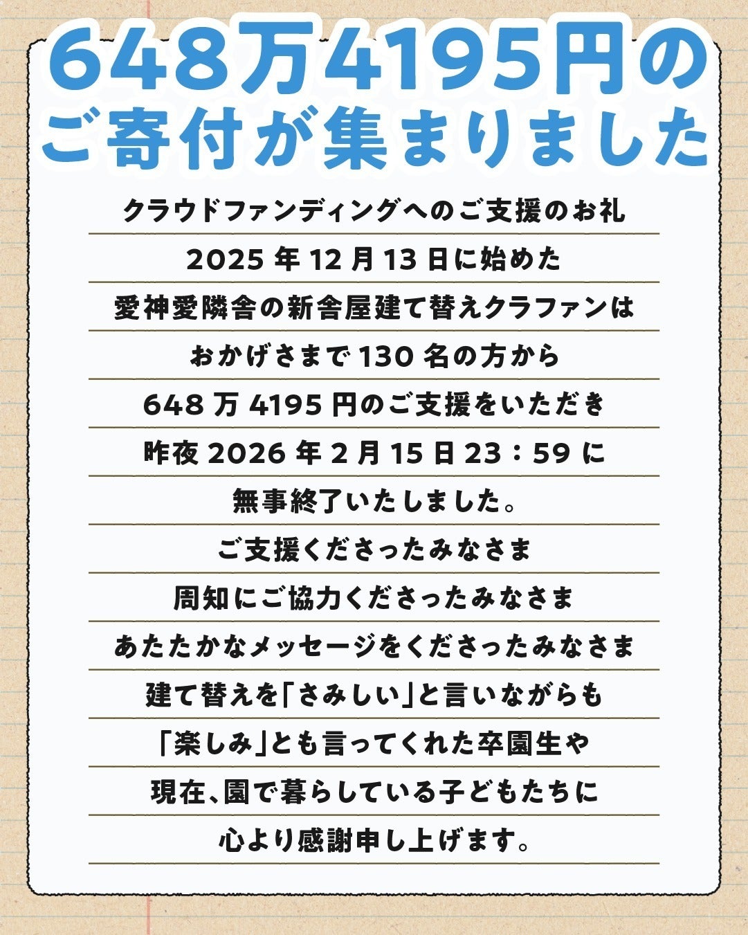 2026/02/18 15:432025年12月13日に始めた愛神愛隣舎の新舎屋建て替えクラファンは、おかげさまで130名の方から648万4195円のご支援をいただき、昨夜2026年2月15日23:59に無事終了いたしました。ご支援くださったみなさま周知にご協力くださったみなさま、あたたかなメッセージをくださったみなさま、建て替えを「さみしい」と言いながらも「楽しみ」とも言ってくれた卒園生や現在、園で暮らしている子どもたちに心より感謝申し上げます。 もっと見る