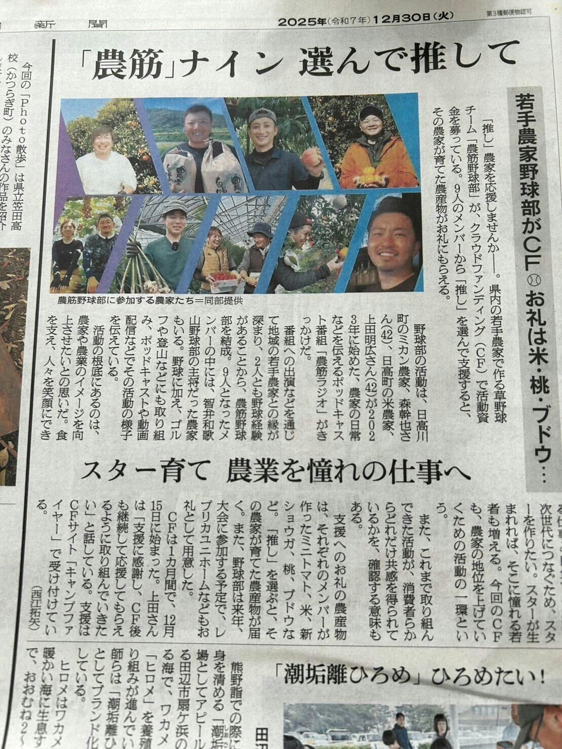2026/01/06 11:21「農筋」ナイン― 選んで推して―すてきな見出しですよね??!!この度、農筋のクラウドファンディングの取り組みが、朝日新聞さんの地方枠に掲載されました!!年末のカラー枠に、メンバーの顔写真も大きく掲載いただき、本当にうれしく、ありがたい気持ちでいっぱいです。この記事を通して、「面白いことをやっている農家おるな!」と感じていただけたら嬉しいです。残り9日!引き続き、農筋をどうぞよろしくお願いします! もっと見る