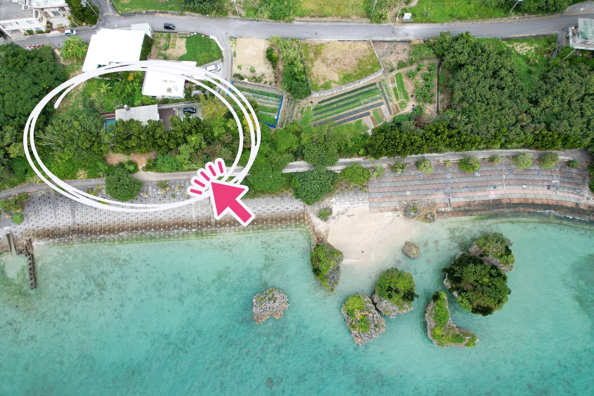 沖縄県南城市の海辺に位置し、宿から徒歩すぐでビーチへ出られるロケーションです。