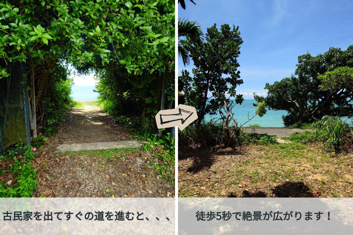 沖縄県南城市の海辺に位置し、宿から徒歩すぐでビーチへ出られるロケーションです。