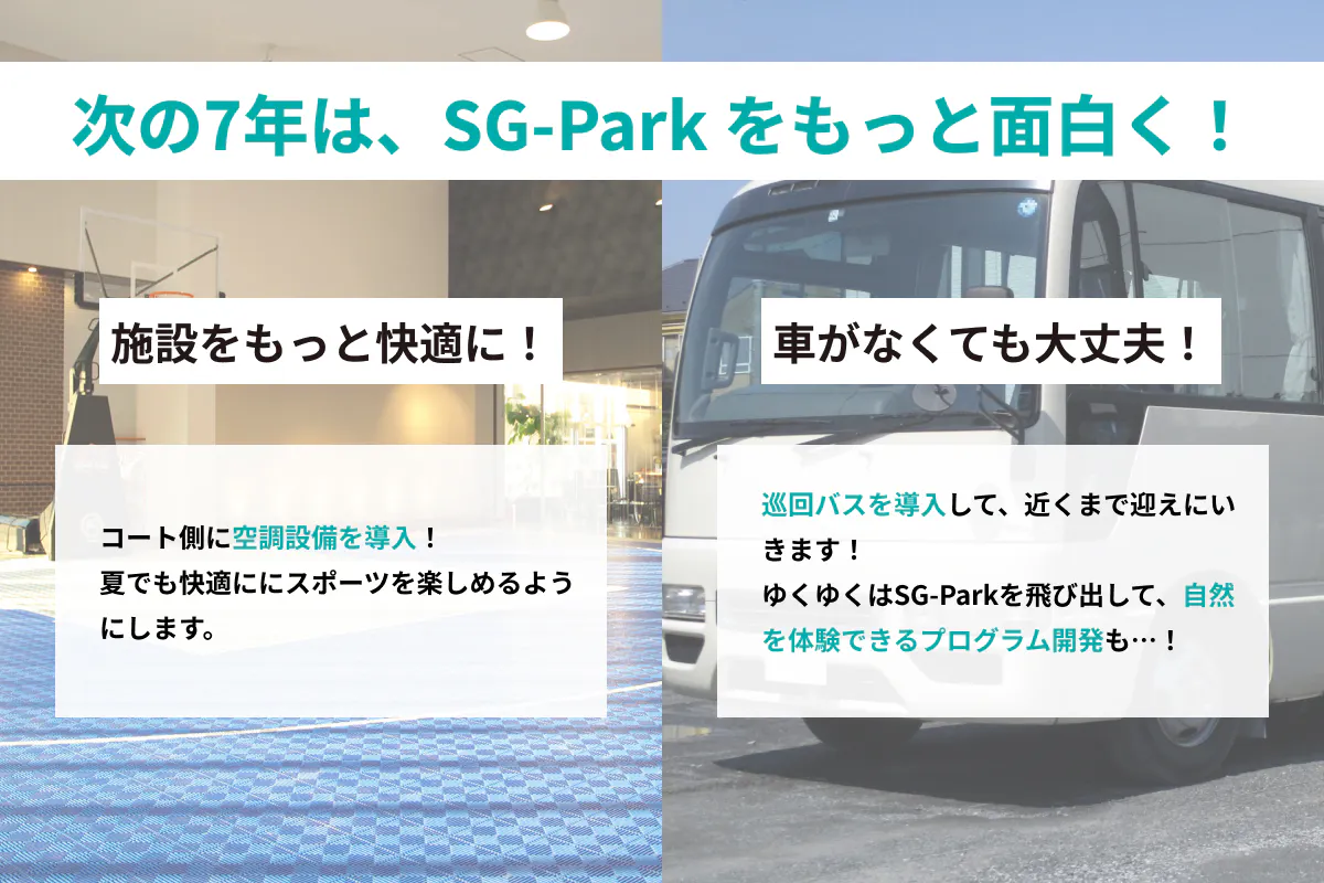 バスという移動手段によって子どもたちの送迎や、より多くの人を迎えに行け、さらには、SG-Parkを飛び出して自然を体感できるプログラムの開発など、段階的にアップデートしていくための資金として活用させていただきます。