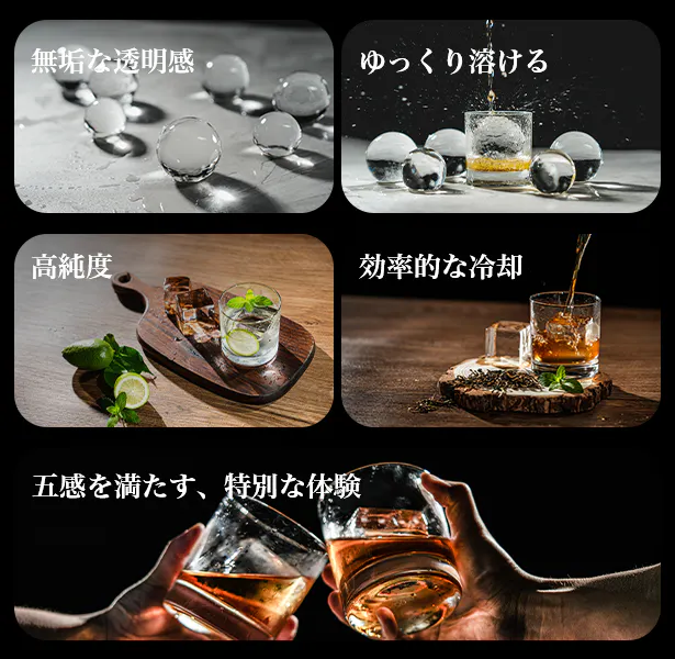 ウイスキーやブランデーなど、ストレートで楽しむお酒にぴったり。溶けにくい高密度氷だから、味が薄まらず最後の一口まで美味しさをキープ。見た目にも美しく、まるでバーにいるかのような贅沢なひとときをご自宅で味わえます。