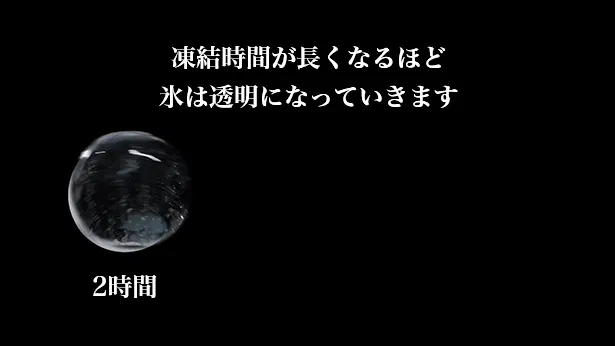 急速な冷却では、氷は透明になりにくく、結晶の生成が不規則になりやすい上、凍結中に水中の空気を効率よく排出できず、白く濁った「白濁現象」を引き起こします。