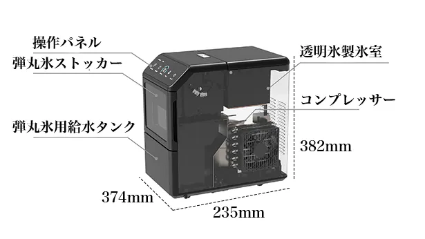 庫内・貯水タンク・冷却システムが連携することで、水中の気体や不純物を効果的に除去し、透明度の高い「透明氷」を生成します。