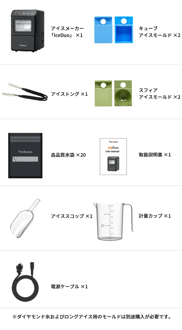 「IceDuo」 なら、専用モールドで球形・角形・ダイヤモンド形・柱形など、プロ顔負けの透明氷を自在に作成可能。