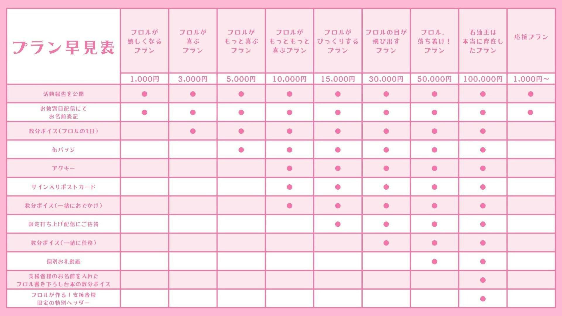 どのプランでどのリターンが入手できるかは、下の表の支援プラン一覧表や、個別のリターンページ詳細欄をご覧ください✨