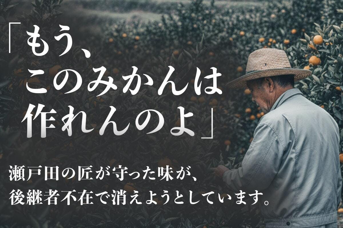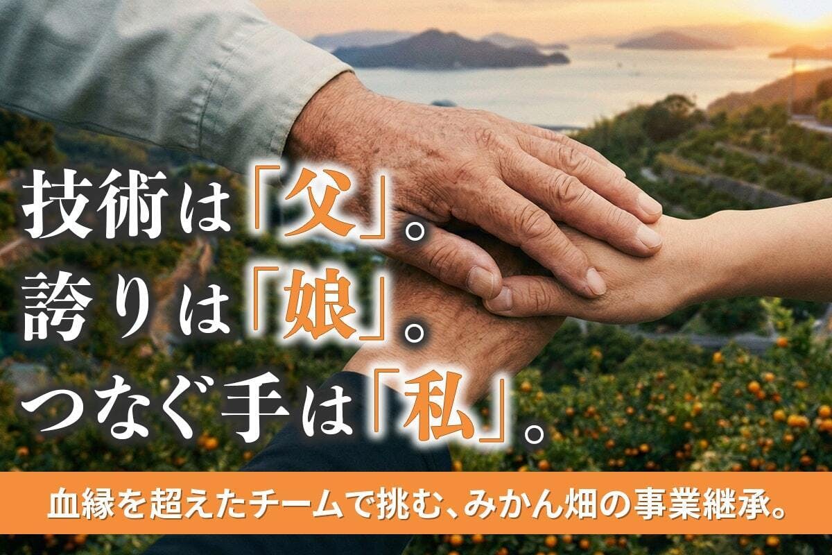 高齢化で失われる「日本の美味しいみかん」を守りたい。これは”生きた”みかん畑を継承する物語。80代の卓越した「技術」と、娘さんの「誇り」。足りない「引き継ぐ手」になるため、同じ農家である私が「体力」と「伝える力」で、血の繋がりを超えたチームに加わります。