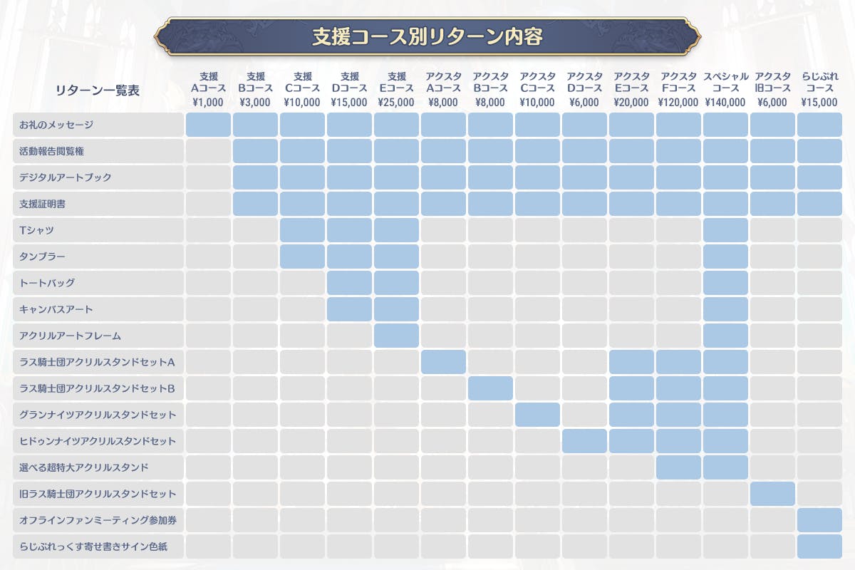 コースとリターン内容の一覧は、以下の画像をご確認ください。