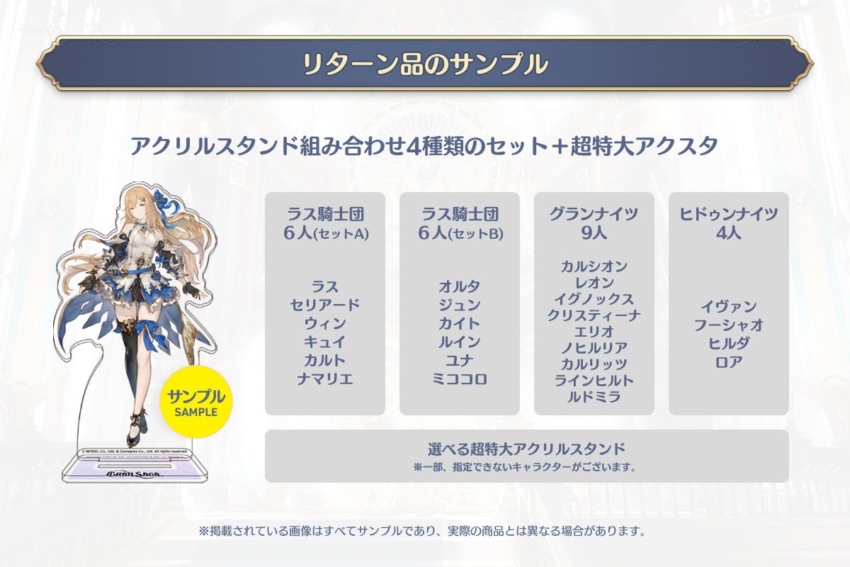 「ラス騎士団アクリルスタンドセットA」「グランナイツアクリルスタンドセット」のデザインが確定したため、サンプル画像を更新しました。