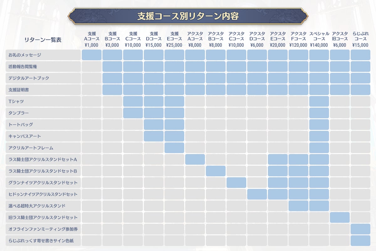 コースとリターン内容の一覧は、以下の画像をご確認ください。