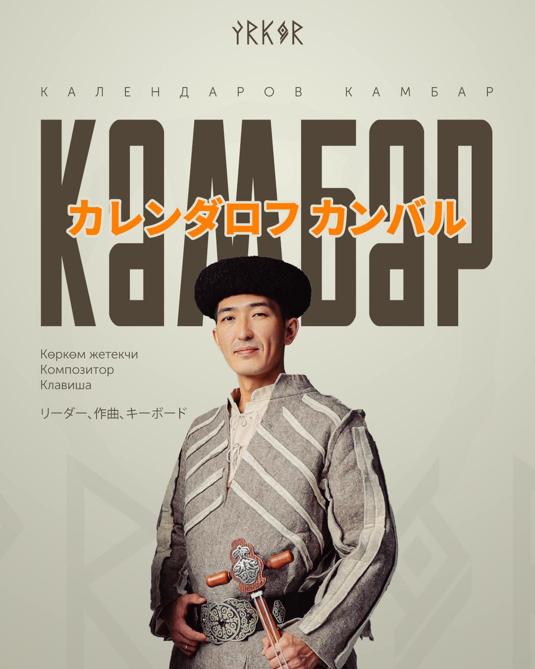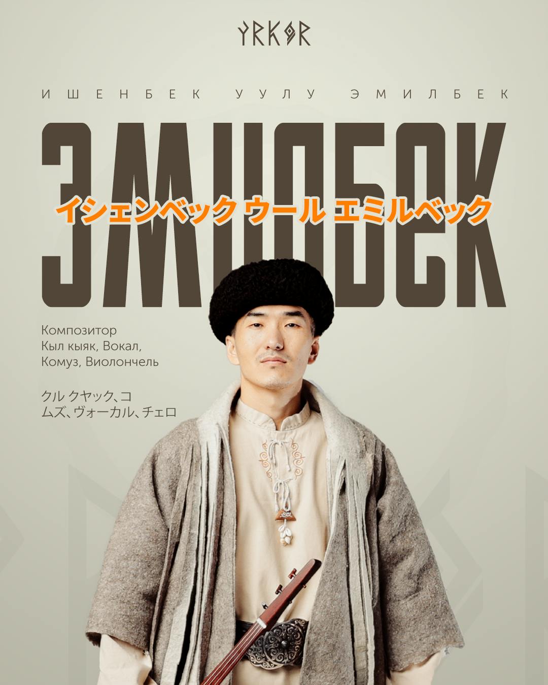 ウルコルの「魂」とも言える歌声を担います。コムズ奏者として力強く優美な技術を見せる一方で、その歌声は一瞬にして会場をキルギスの大自然へと変える力を持っています。伝統アンサンブル「ムラス」と「ウルコル」の双方で活躍する、グループに欠かせないフロントメンバーです。