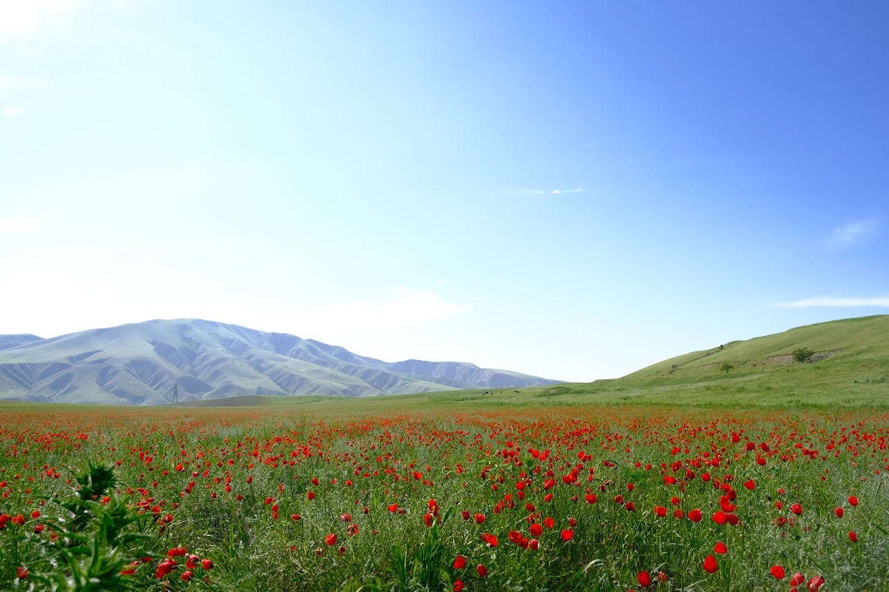 雪解けの春、高原では花々が一斉に芽吹きます。万年雪のふもとに広がる草原は、一面のポピーに染まり、風が吹くたび赤い波が揺れ動く。