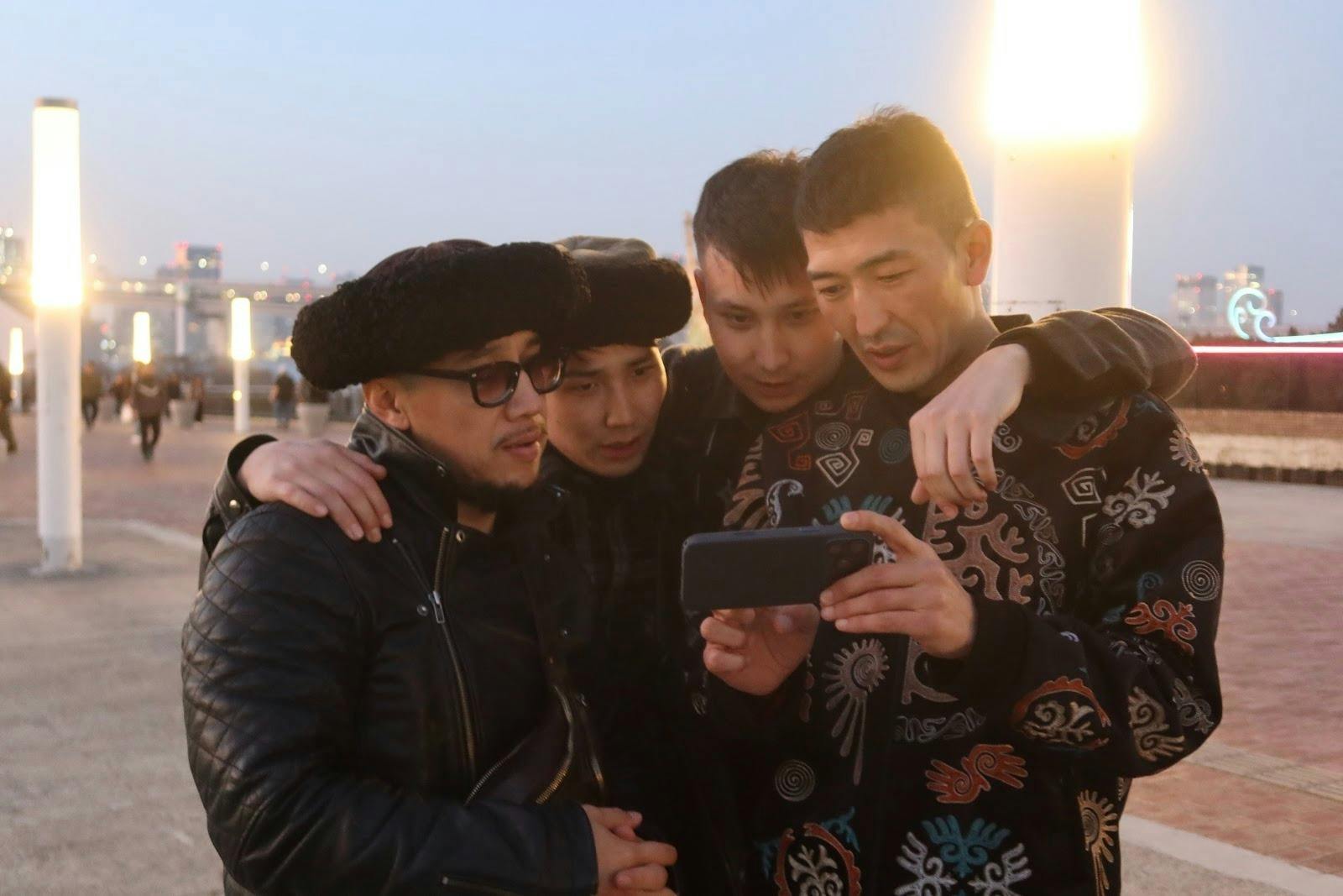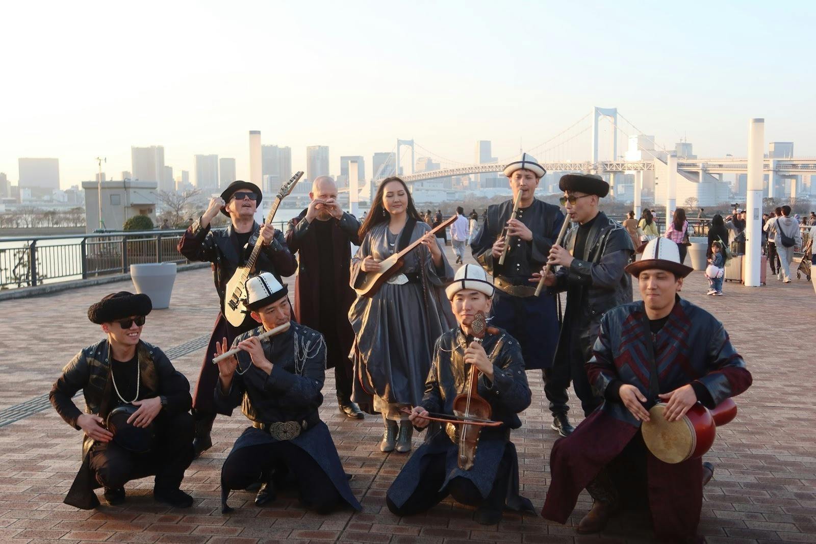 海と空が広がる開放的な景色の中で、カメラの前に立つウルコルのメンバーたち。遠くに広がる東京の景色と、キルギスの音楽を背負った彼らの姿には、異なる世界が静かに重なり合うような、不思議な空気が感じられました。