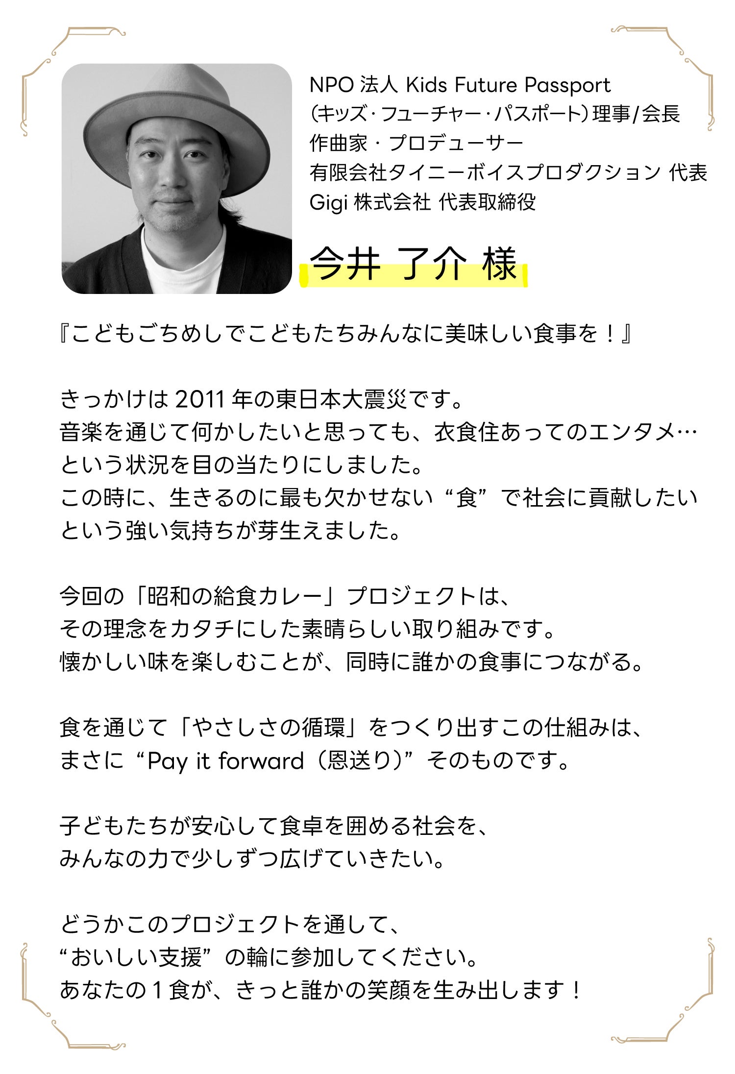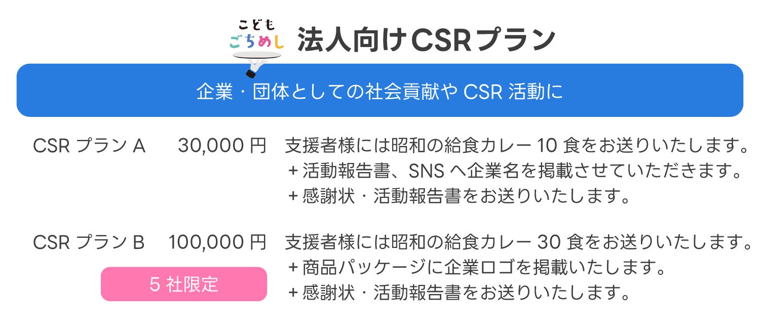 そこで、「こどもごちめし」と出会い、掲げている‘Pay it forward’(恩送り・利他)に共感し、今回このプロジェクトを立ち上げることにしました。今回のカレープロジェクトは1回で終わりではなく第2弾、第3弾と続けていきます。半永続的にこどもを支援できる仕組みを作ります。「食べることが支援になる社会」を実現し、誰もが気軽に参加できる社会貢献の仕組みを目指します。