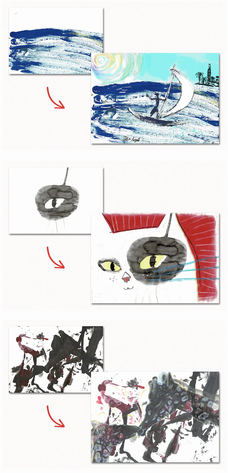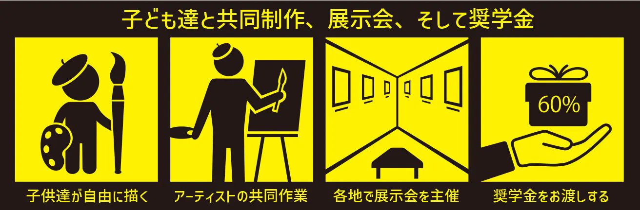 全国の福祉施設や個人家庭で実施するワークショップ等を通じて子どもたちの原画を作成し、それを賛同アーティストが受け取り、感性と技術を加えて作品化。その後、商業施設やギャラリーで開催される展示会にて一般公開され、希望者への販売が行われます。