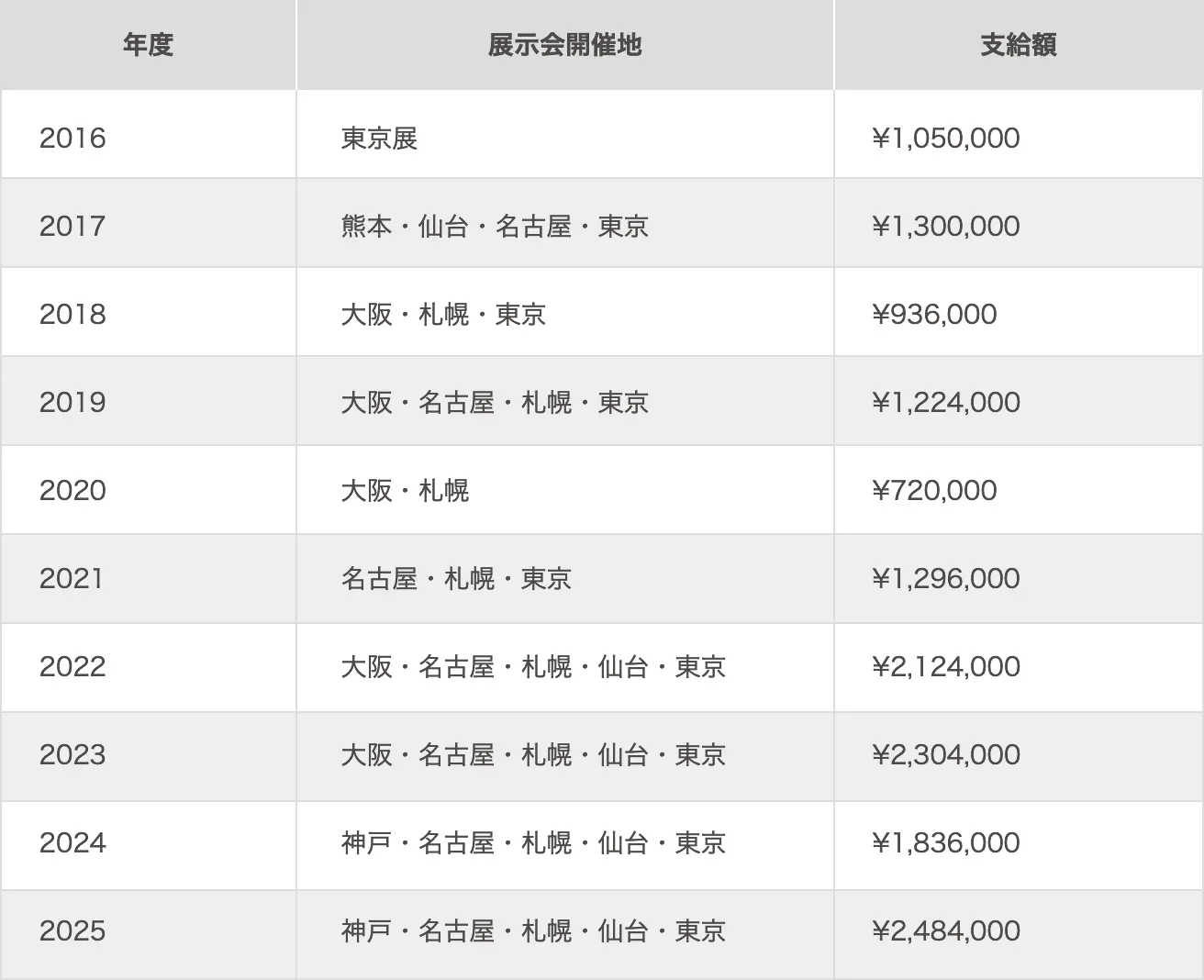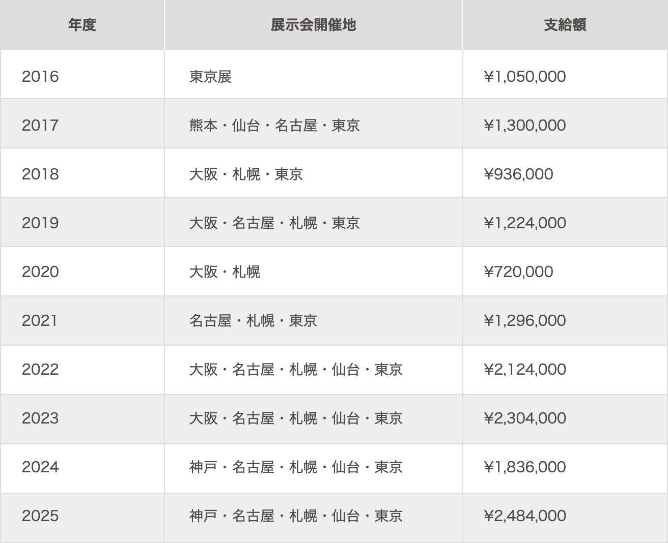 これまでに東京、札幌、仙台、名古屋、神戸など全国各地で展示会を開催し、累計1,500万円以上の奨学金を支給。