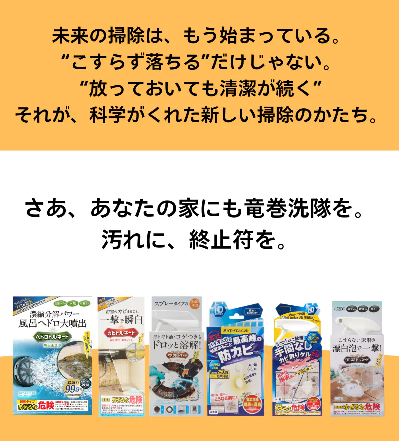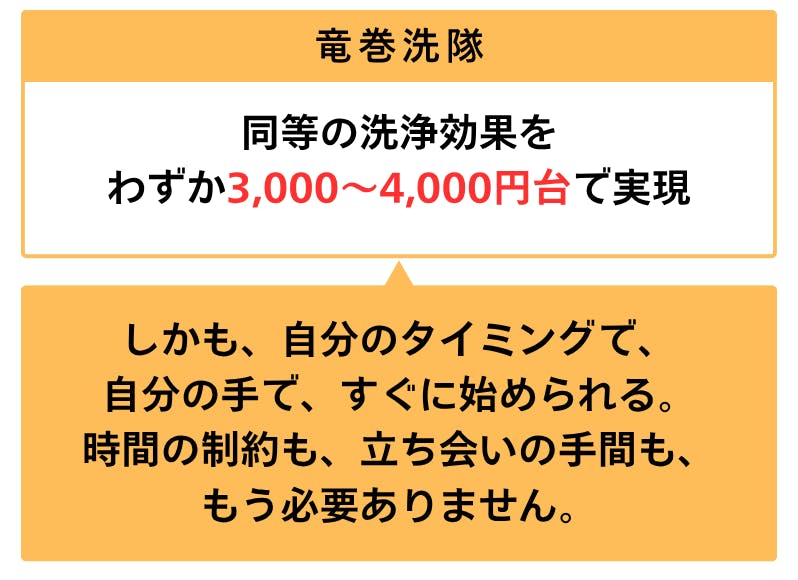 「プロに頼まなきゃ落ちない」と言われた汚れを、自分の手で、驚くほど手軽に落とせる。それが竜巻洗隊です。