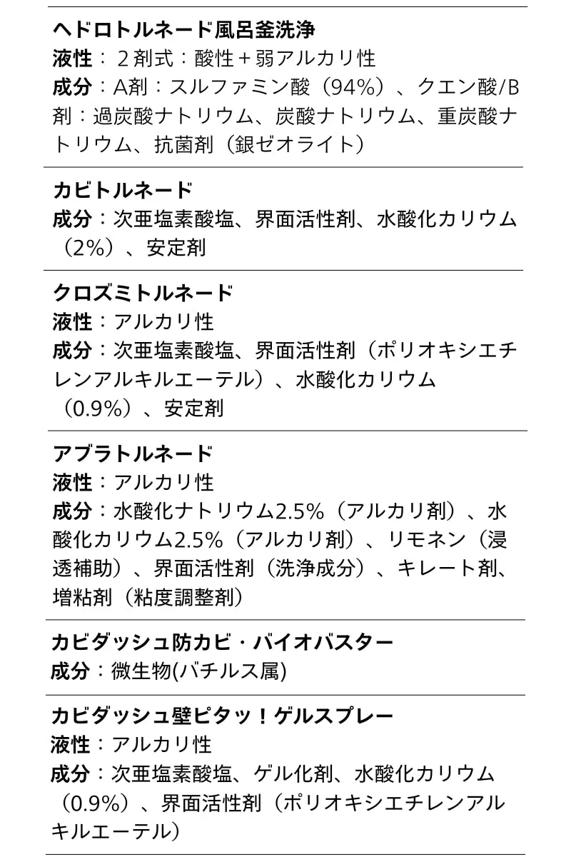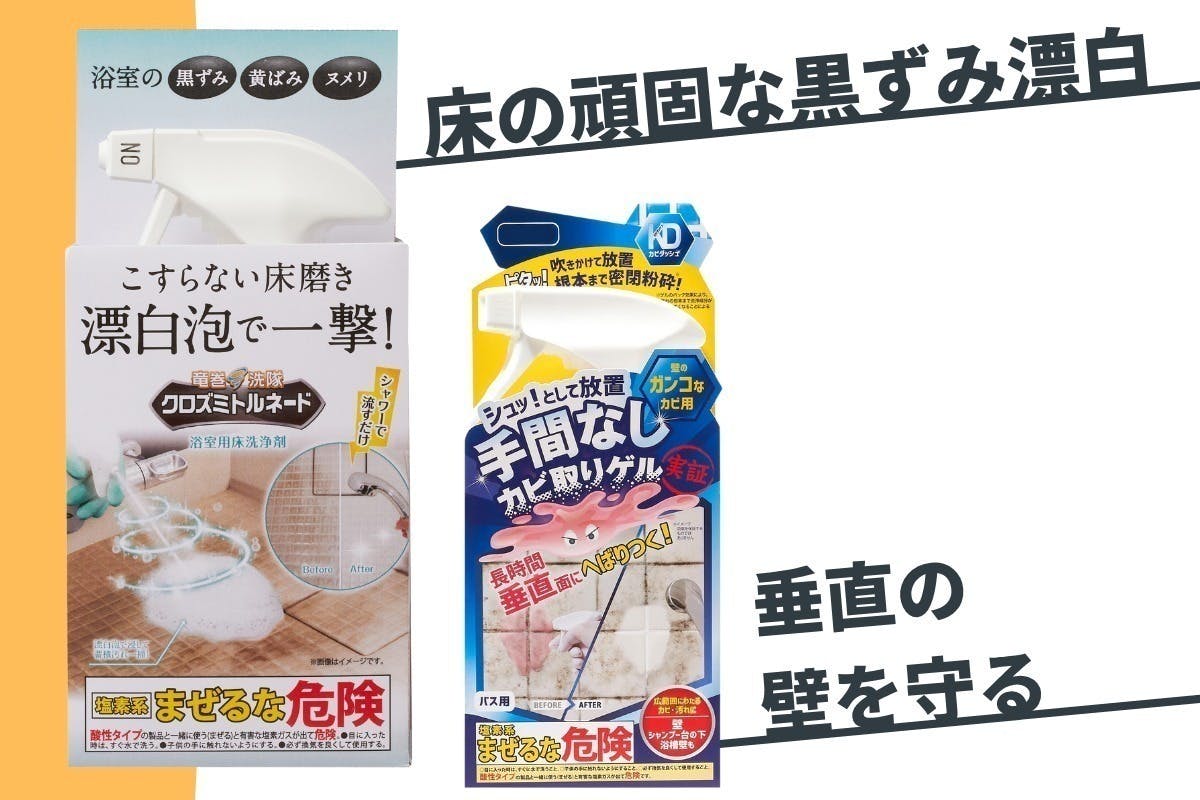 A. 「カビトルネード」「カビダッシュ壁ピタ」など一部製品には漂白用の塩素成分が含まれますが、密着ジェル化されているため、飛散や刺激臭が極めて少ない処方になっています。使用後は水でしっかり流していただければ、臭いもほとんど残りません。