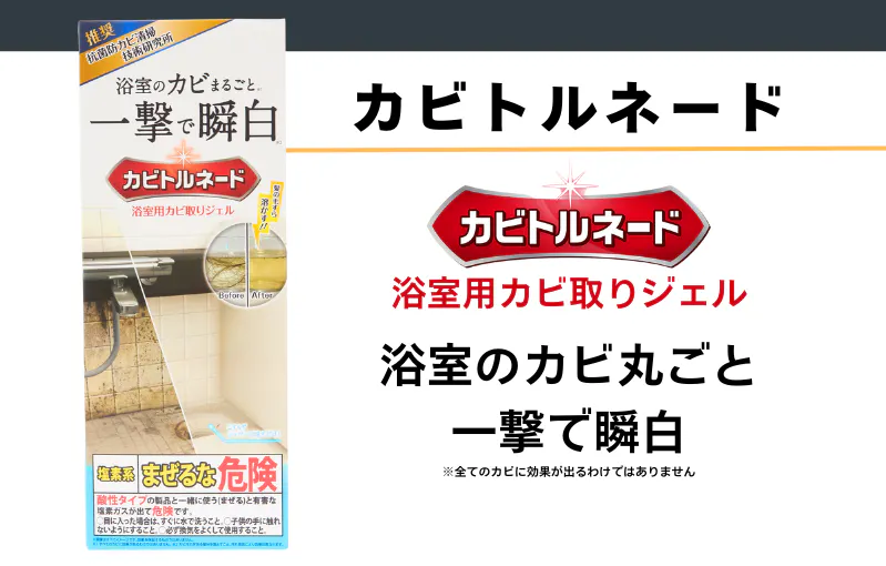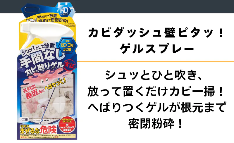高粘度のジェルがカビの根まで密着して分解し、むせない・垂れない・残さない。こすらず放置で、壁もパッキンも真っ白に戻します。
