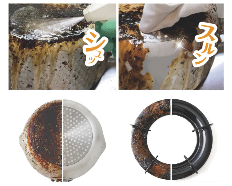 強アルカリのジェルが、焦げや酸化した油を化学的に分解します。換気扇やグリル、五徳も、ただ塗って放置するだけ。手間ゼロで「もう戻れない」ほどの清潔感を取り戻します。