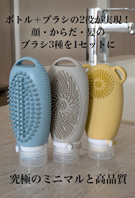 これは、単なる詰め替えボトルではありません。漏れや無駄を許さない高品質シリコン製ボトルに、洗顔、ボディ、ヘアケアそれぞれの専用ブラシを融合させた、革新的なトラベルギアです。あなたの旅のエコとミニマルを最高品質でサポートします。