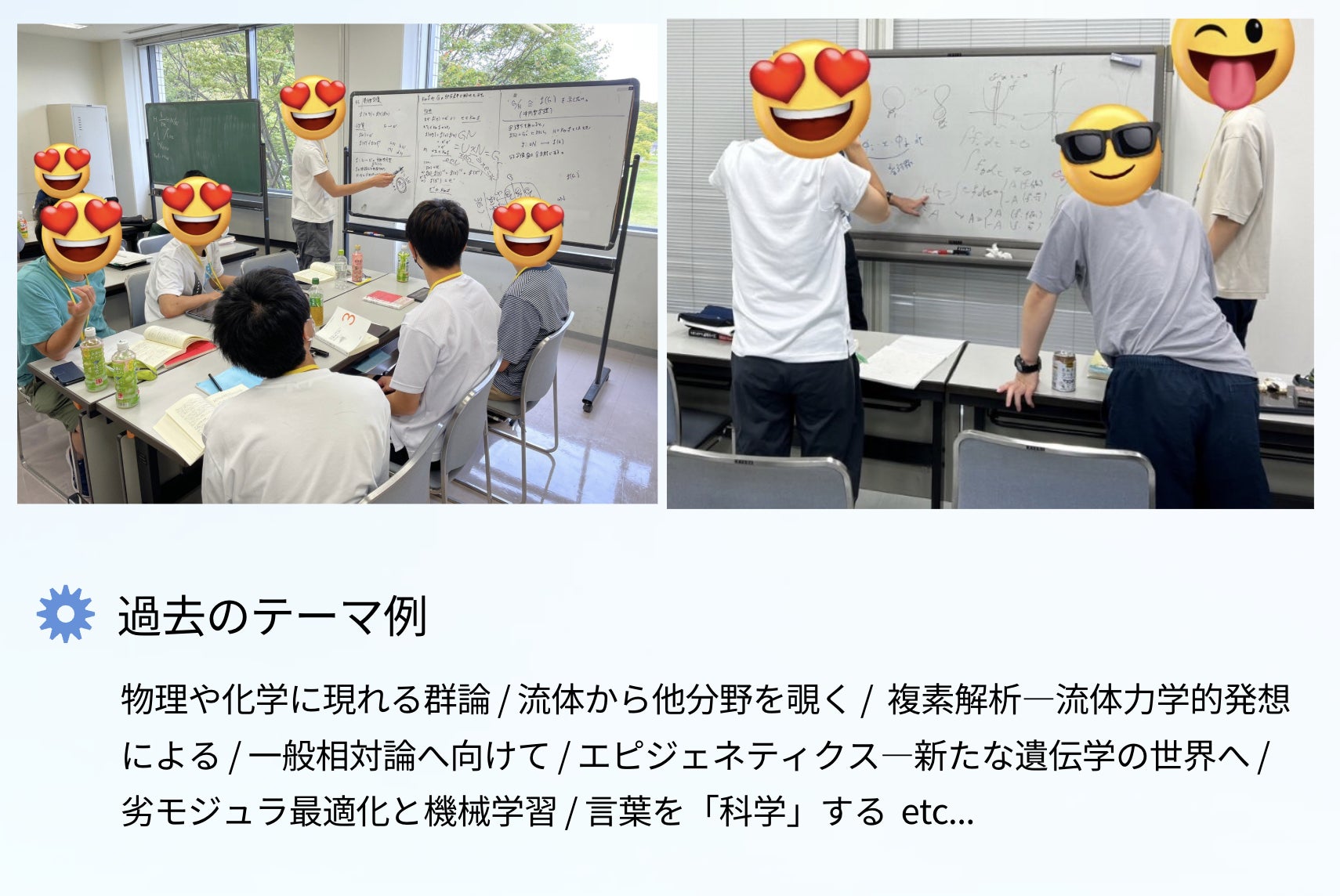私たちの活動は単なる勉強会にとどまりません。数学、物理、化学、生物、地学、情報科学から工学、言語学に至るまで、専門分野の壁を越えて学生が集い、